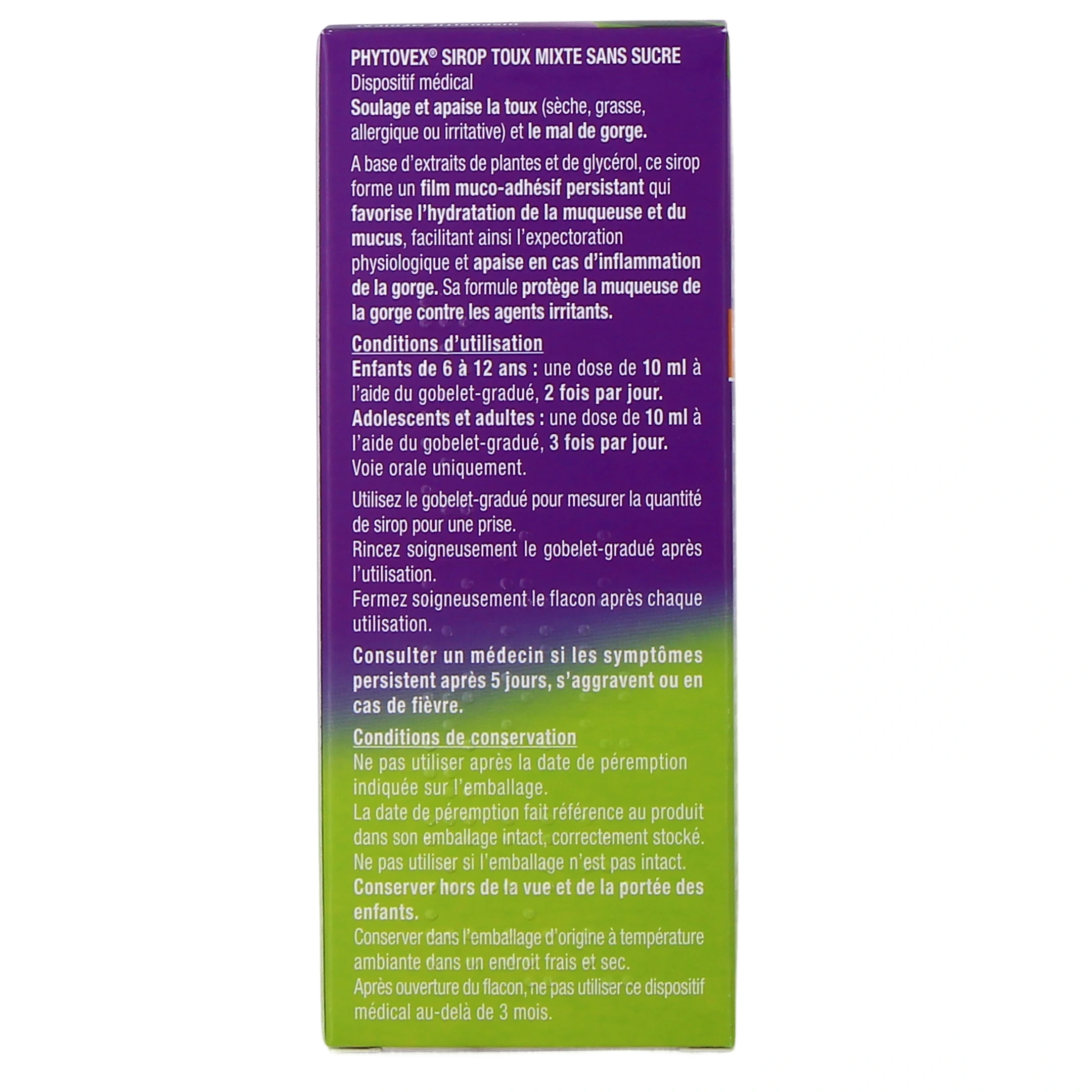 Le sirop toux mixte Phytovex UPSA s'adresse à l'adulte et à l'enfant à partir de 6 ans. La dose indiquée est de 10 ml 2 fois par jour pour les enfants de 6 à 12 ans ; 10 ml 3 fois par jour pour les adolescents et les adultes. Utilisez le gobelet gradué pour mesurer la quantité de sirop pour une prise. Rincez-le soigneusement après chaque utilisation et refermez bien le flacon. Consultez un médecin si les symptômes persistent, s'aggravent ou en cas de fièvre. Précautions d'emploi du sirop Phytovex :- Ne pas utiliser chez l'enfant de moins de 6 ans.