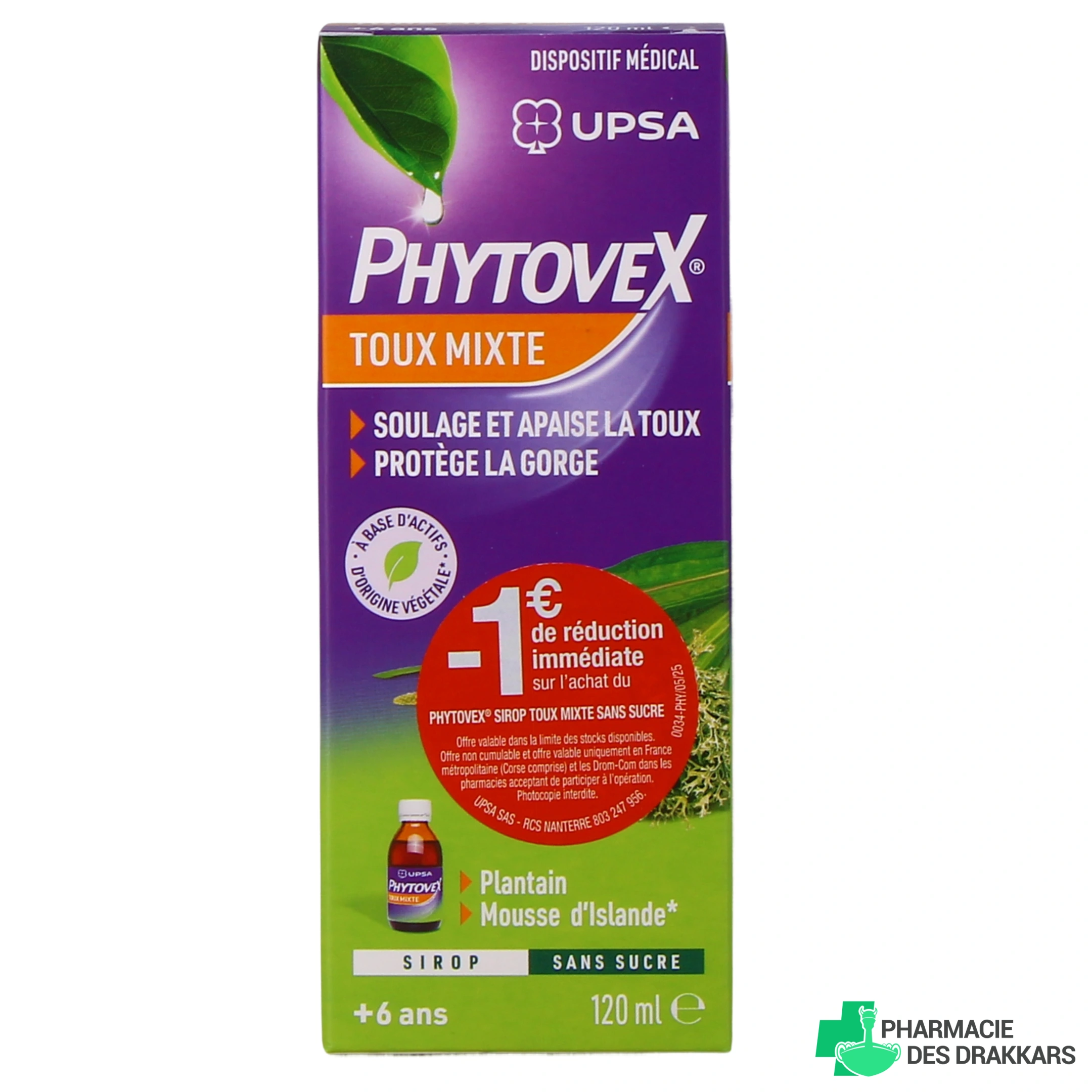 Les présentations disponibles pour le sirop toux mixte UPSA Phytovex sur notre pharmacie en ligne : Flacon de 120 ml avec gobelet doseur, ou offre spéciale -1€ (sous réserve de disponibilité).