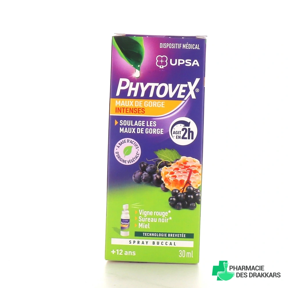 Préconisé dans les affections de la gorge, le spray buccal Phytovex UPSA soulage rapidement et durablement les maux de gorge intenses. Il contient des extraits de plantes, à savoir la vigne rouge et le sureau noir, ainsi que du miel et du glycérol d'origine végétale. Sa formule brevetée dépose un film protecteur à la surface de la gorge. Ce film contribue à calmer le mal de gorge dès la première pulvérisation et soulage les douleurs intenses en 2 heures après pulvérisations régulières.
