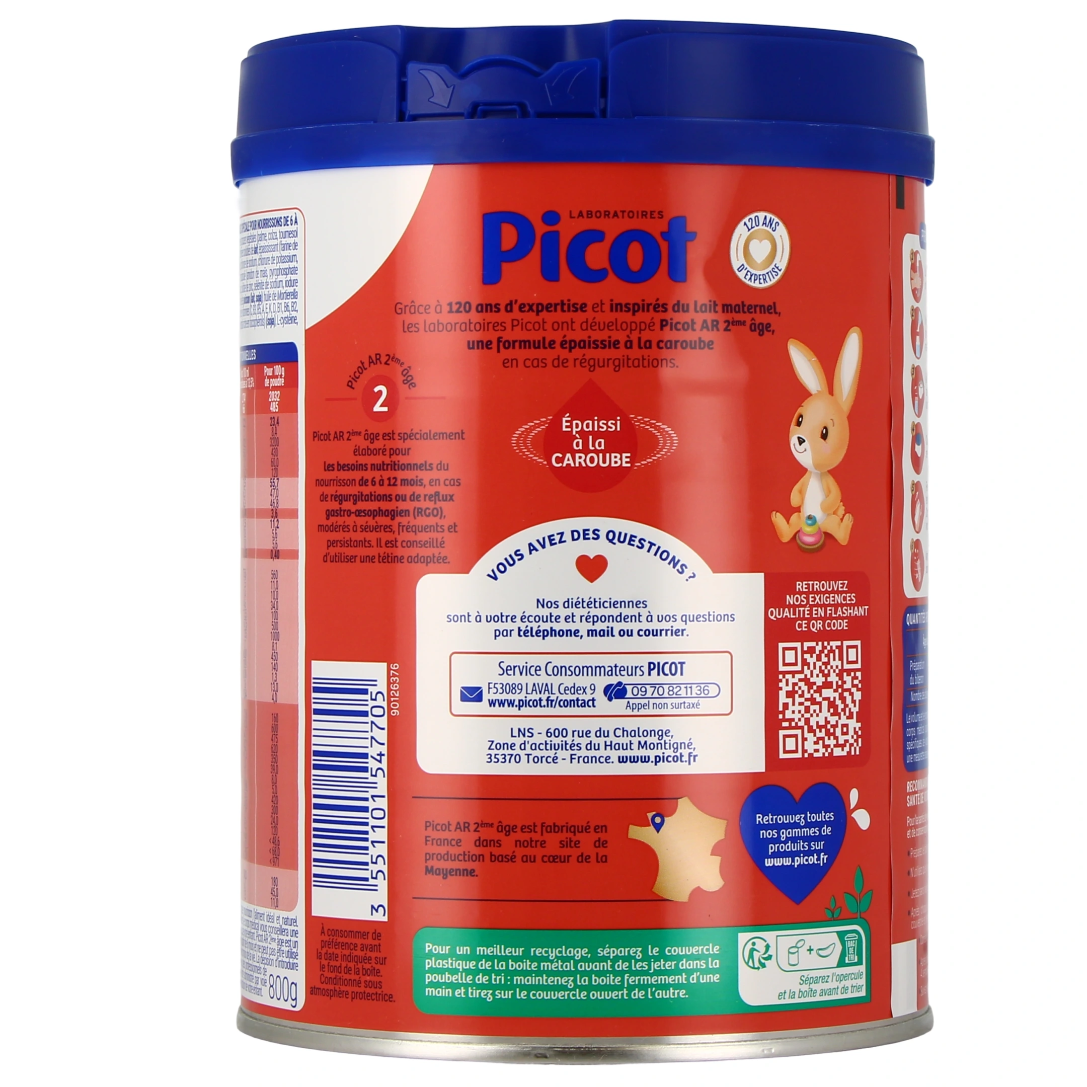 Le lait 2eme âge Picot AR est une denrée alimentaire destinée à des fins médicales spéciales (DADFMS). Il dispose d'une formule épaissie par la gomme de caroube, un composant rendant le lait plus consistant. Ce lait peut être utilisé lorsque la maman ne peut pas ou ne souhaite pas allaiter son bébé.