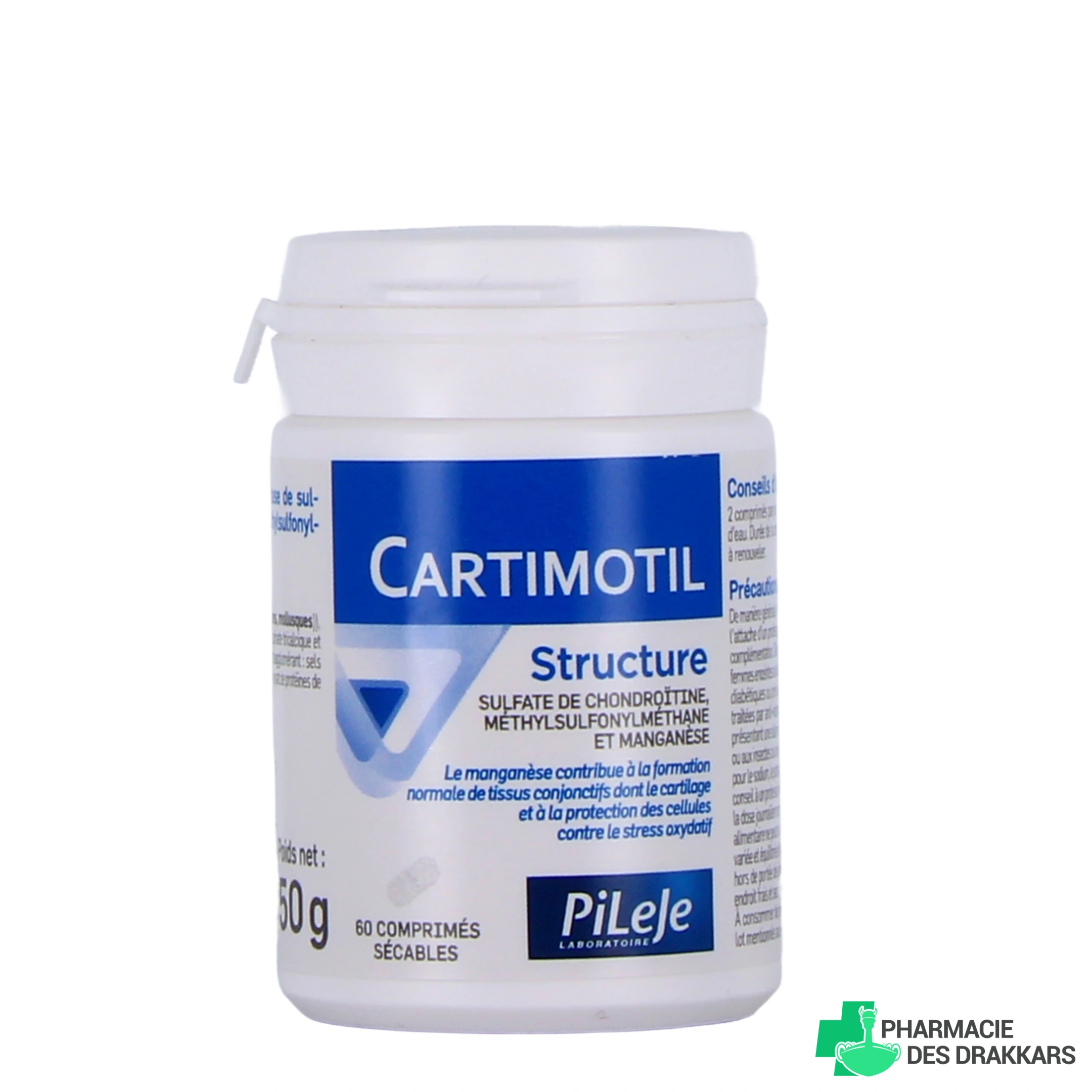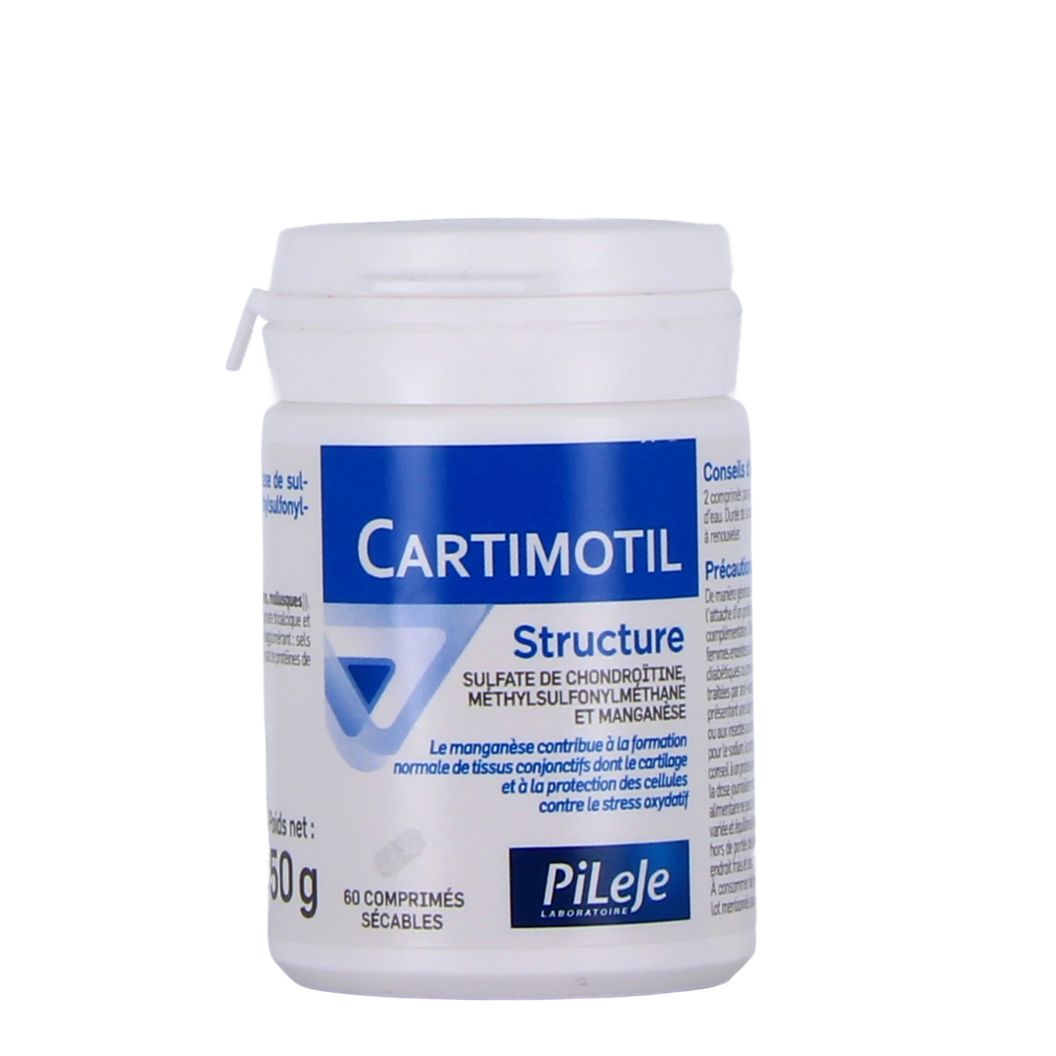 Cartimotil Structure de Pileje est un complément alimentaire à base de sulfate de chondroïtine, de méthylsulfonylméthane et de manganèse qui contribue au maintien du cartilage.
