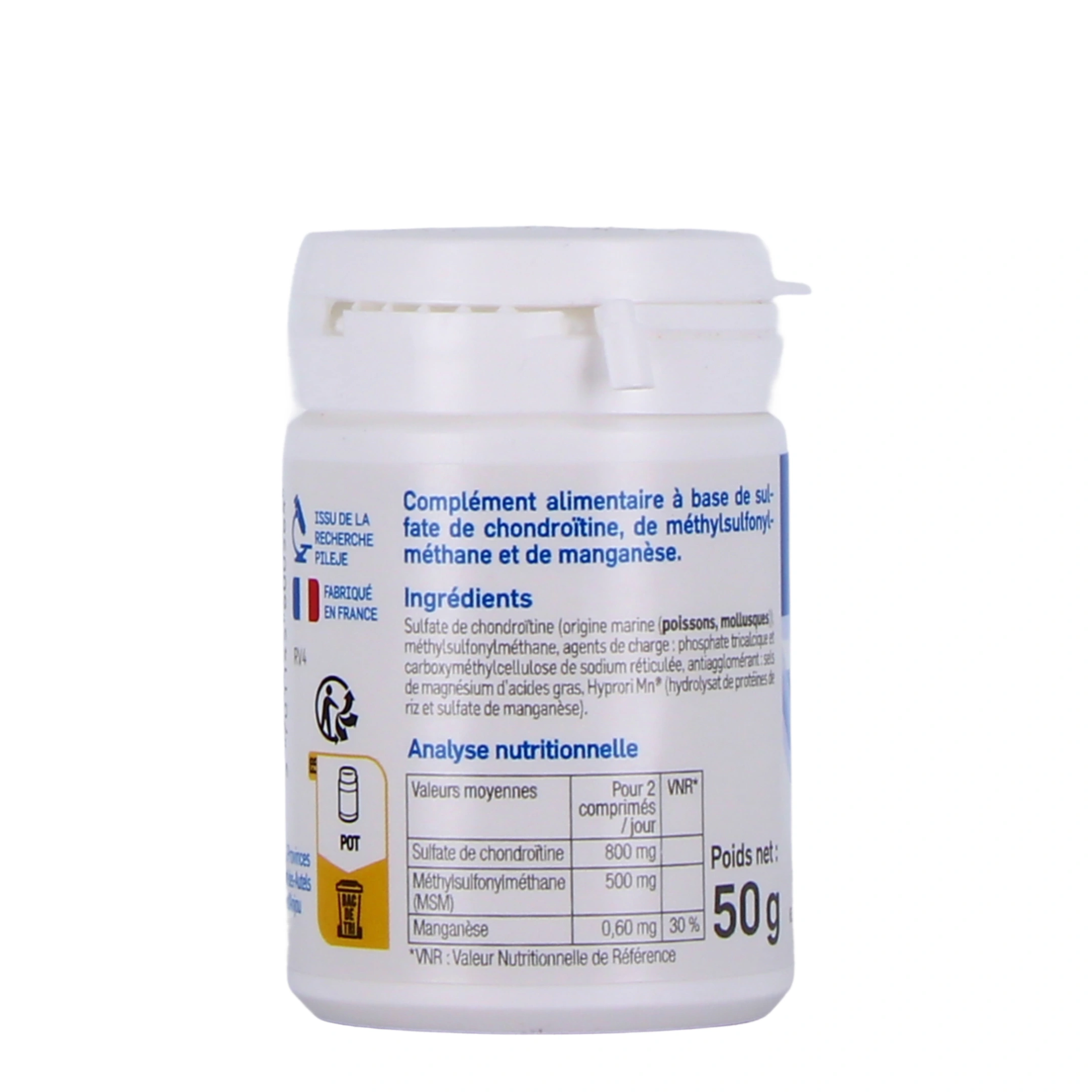 - Chondroïtine sous forme sulfate, qui est un composant naturel du cartilage.