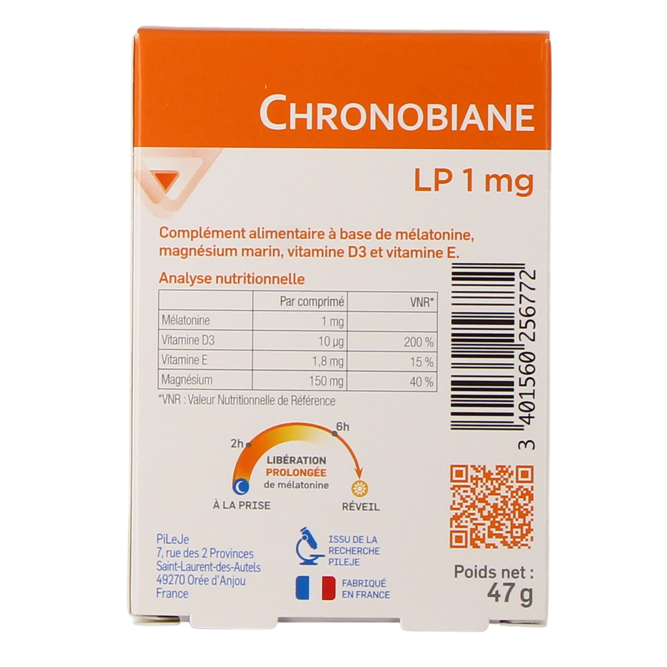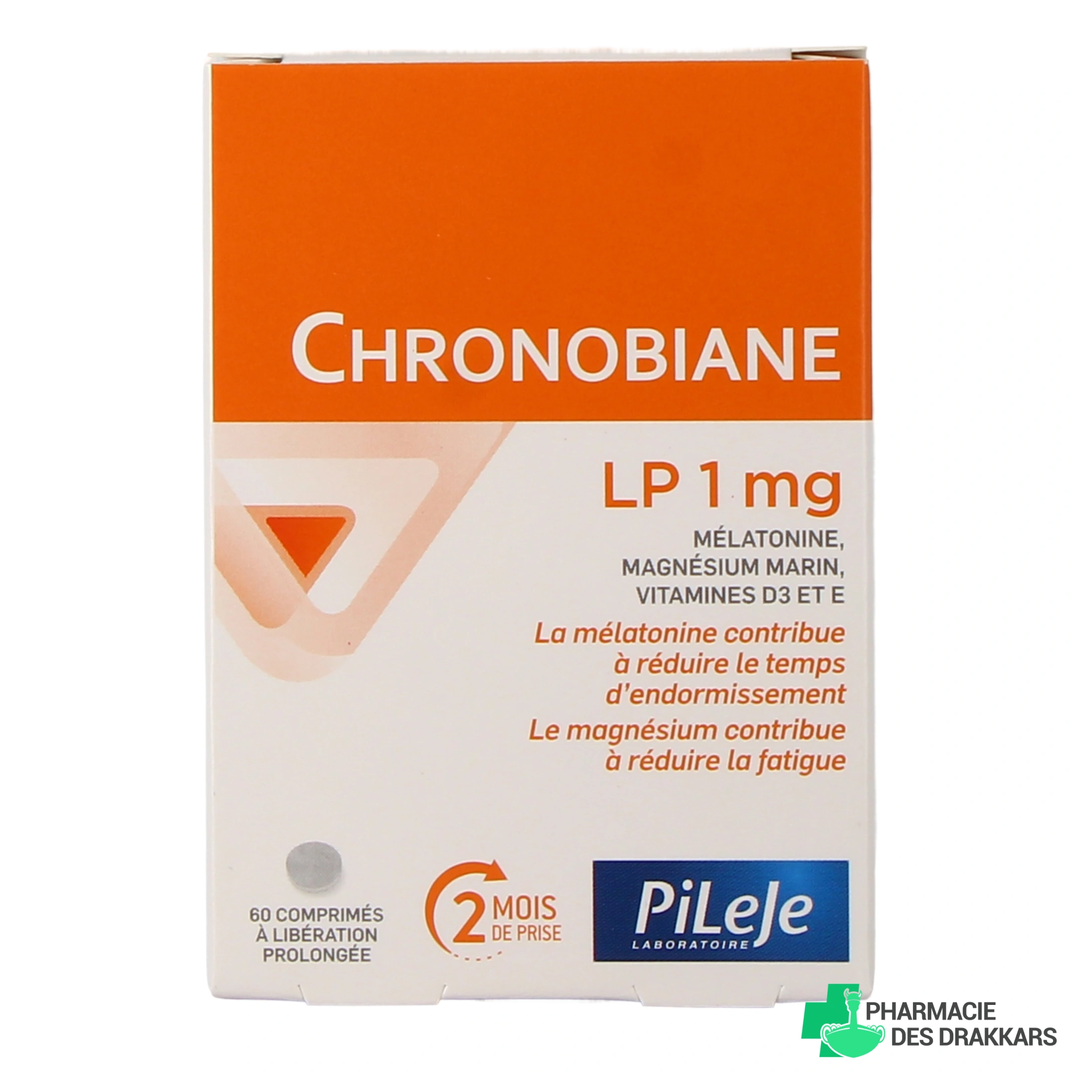 Pileje Chronobiane LP 1 mg est un complément alimentaire formulé à base de mélatonine, magnésium marin, vitamine D3 et vitamine E et indiqué contre les troubles du sommeil ainsi que pour favoriser l’endormissement.