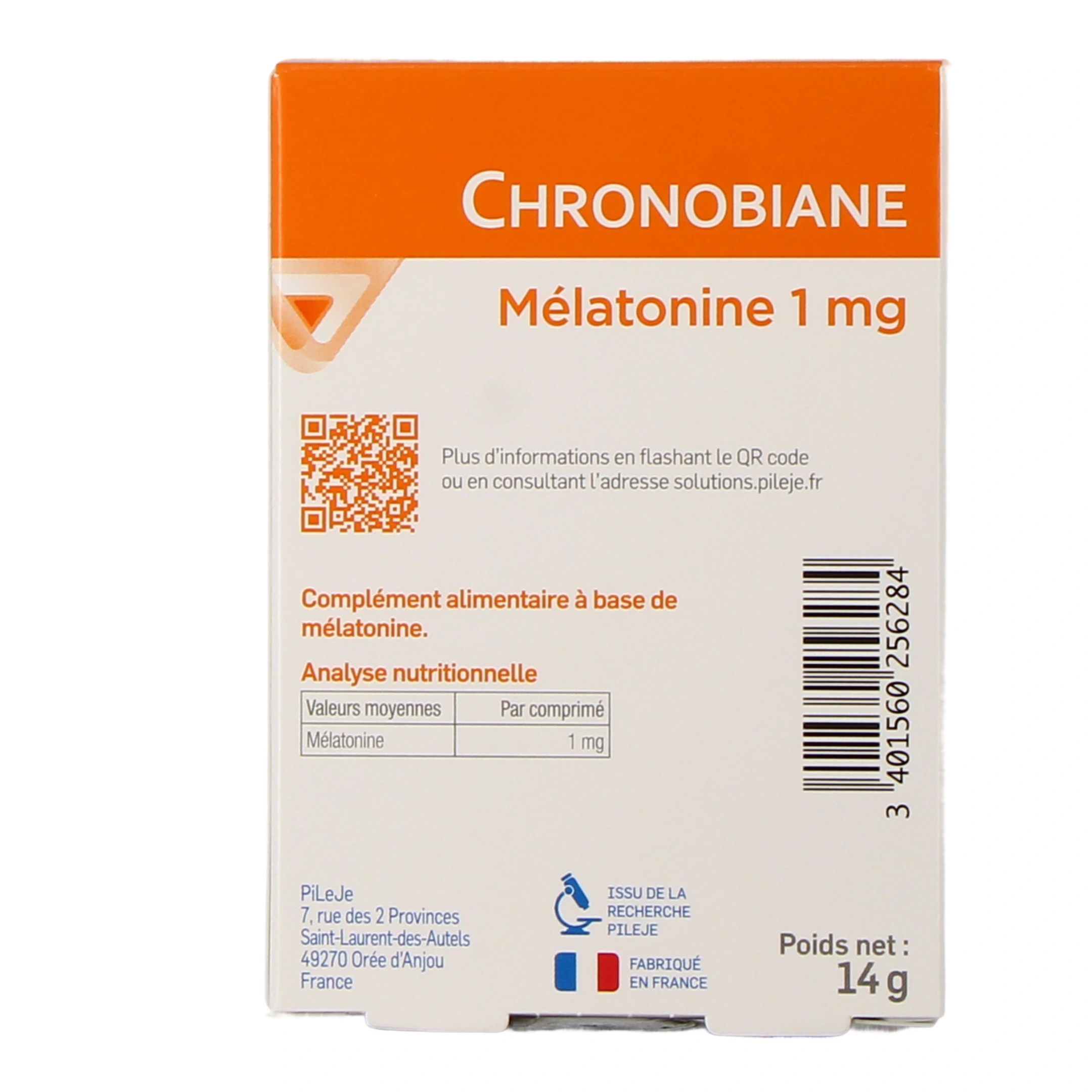 Présentation proposée par notre pharmacie en ligne pour Pileje Chronobiane Mélatonine : Boîte de 30 comprimés.