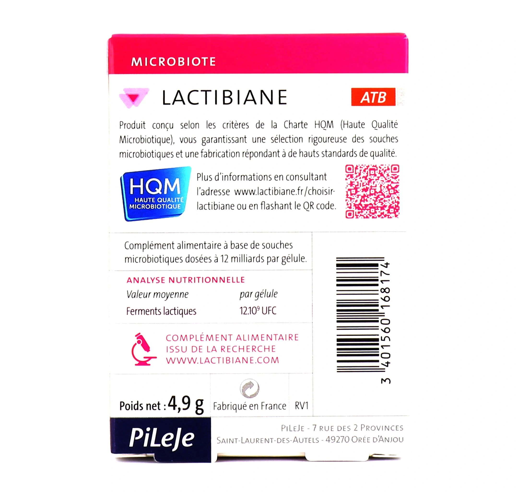 Prévu pour une complémentation de 10 jours, Lactibiane ATB est présenté sous la forme de gélules végétales qui contiennent une souche microbiotique dosée à 12 milliards par unité, le Lactobacillus rhamnosus LA801. Celle-ci est enregistrée à la CNCM (Collection Nationale de Cultures de Microorganismes) et a été rigoureusement choisie par le Laboratoire Pileje pour respecter les différents critères de la charte Haute Qualité Microbiotiques (HQM). Elle dispose de plus d'une résistance à la bile et à l'acide gastrique.