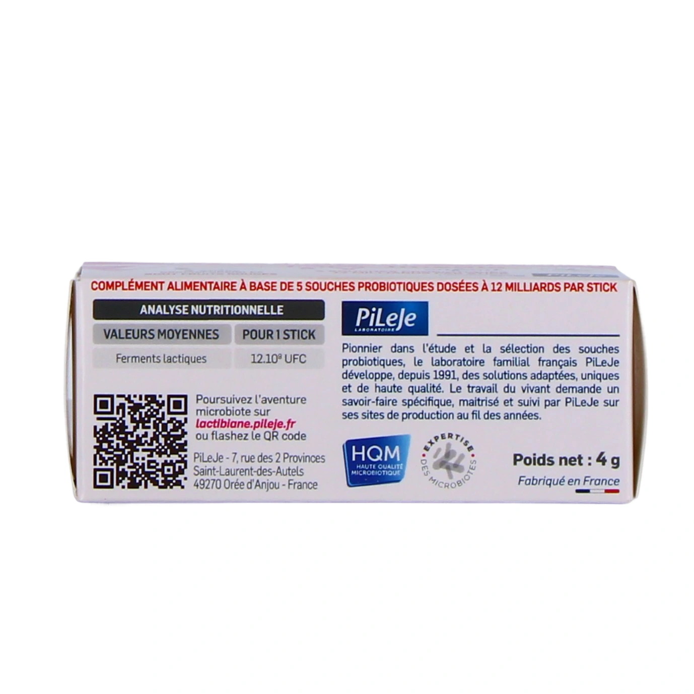 Lactibiane Imedia est un complément alimentaire élaboré par Pileje et présenté sous forme de sticks orodispersibles qui contiennent des souches microbiotiques.