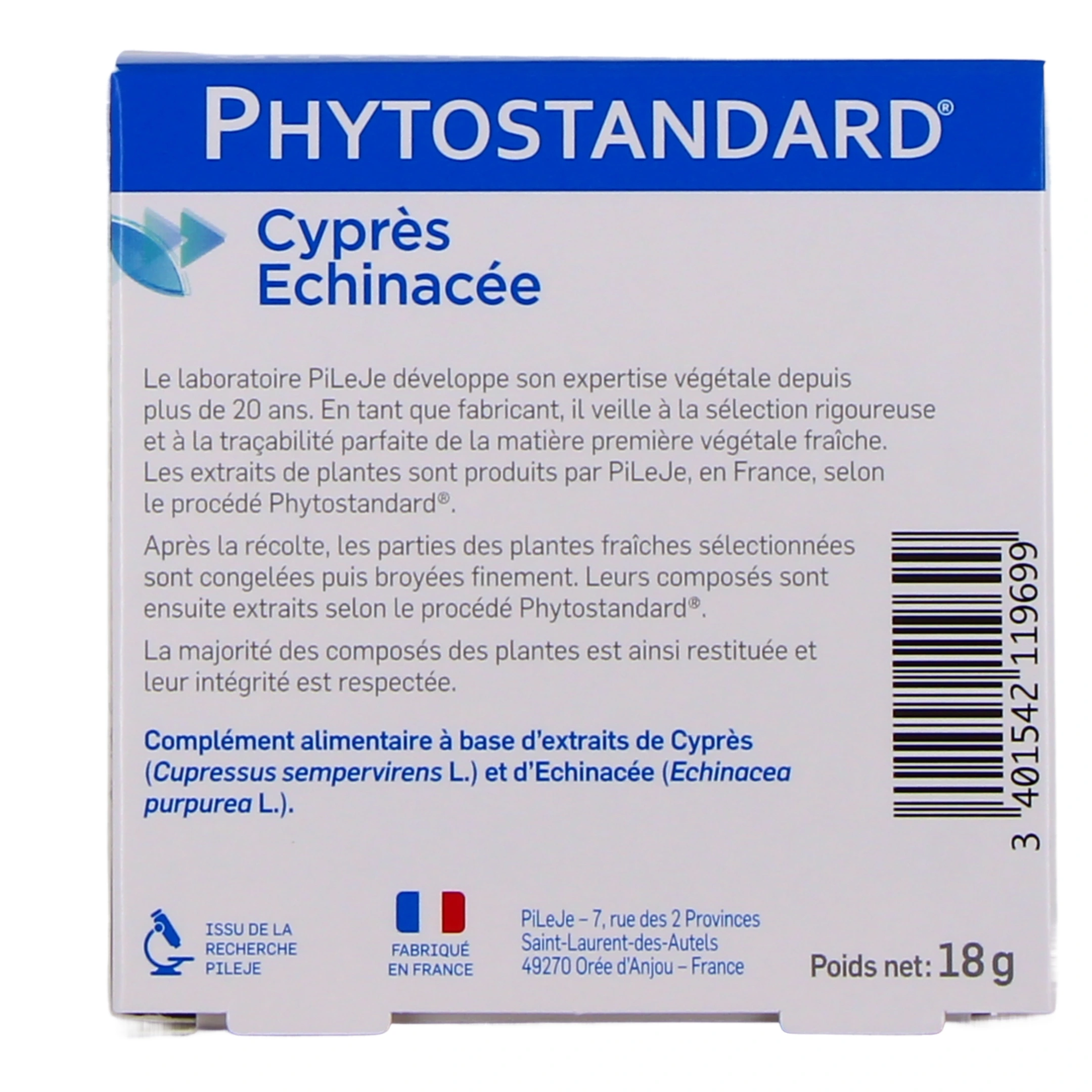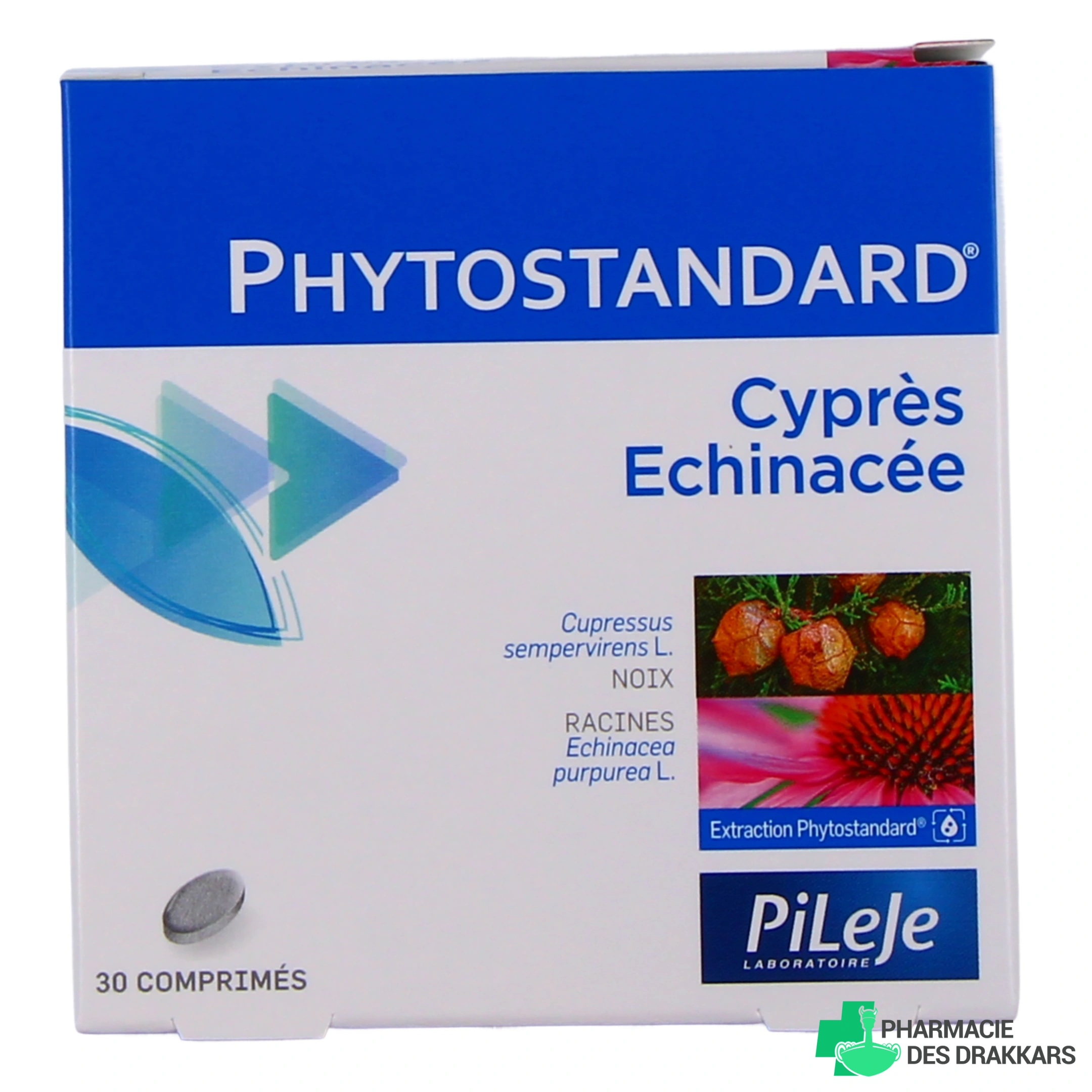 Conditionnement proposé sur notre pharmacie en ligne pour Pileje Phytostandard Cyprès Échinacée : Boîte de 30 comprimés.