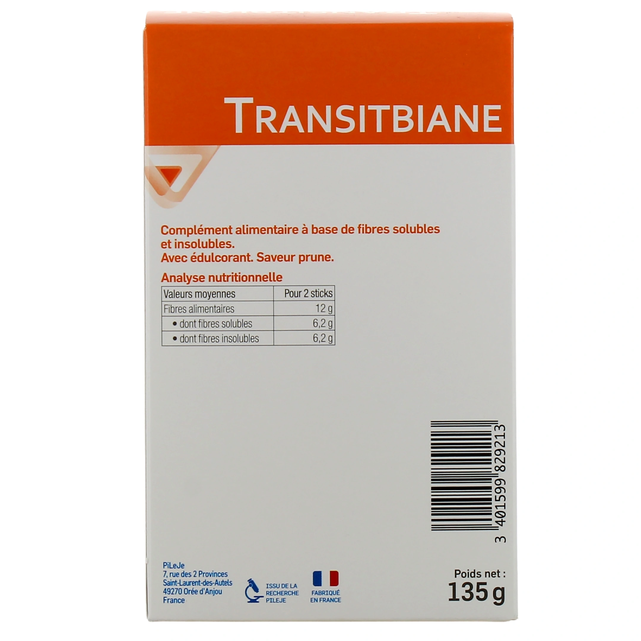 Transitbiane apporte des fibres dont l'apport est souvent insuffisant par l'alimentation actuelle. Il assure un apport en fibres de 6,2 g par stick pour un besoin journalier de 30 g, son goût prune est agréable et la texture du stick Transitbiane dilué dans un verre d'eau n'est pas pâteuse mais particulièrement onctueuse.