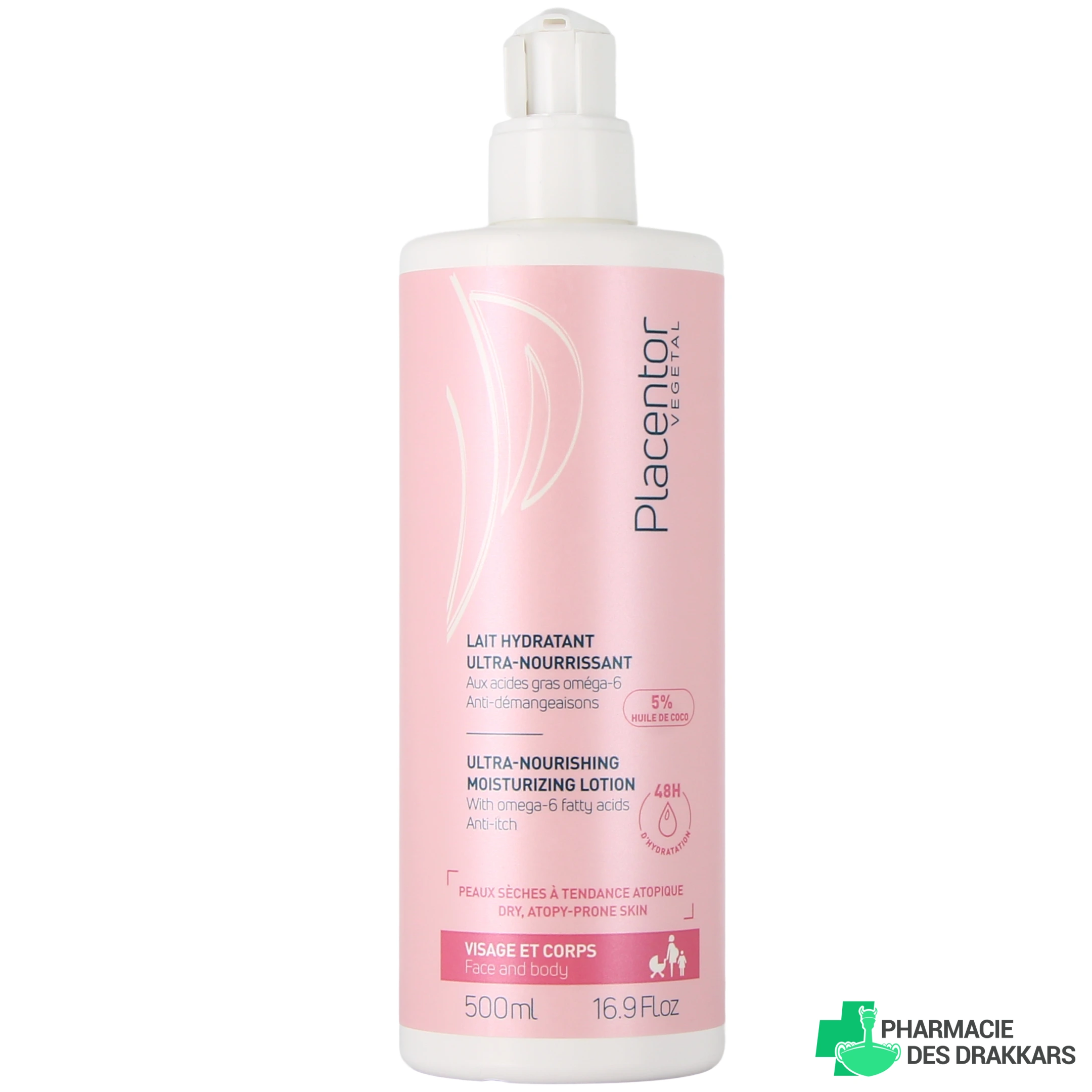 Présentation disponible sur notre pharmacie en ligne pour le lait hydratant Placentor : flacon-pompe de 500 ml.