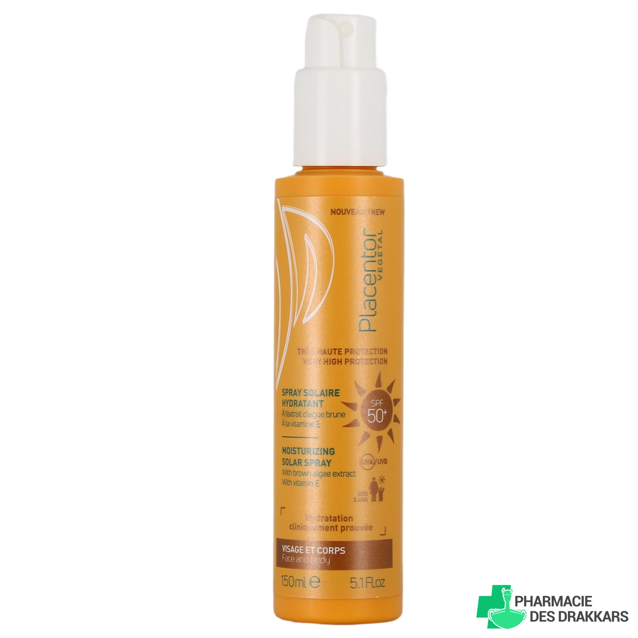 Présentation disponible sur notre pharmacie en ligne pour le spray solaire SPF50+ Placentor : spray de 150 ml.