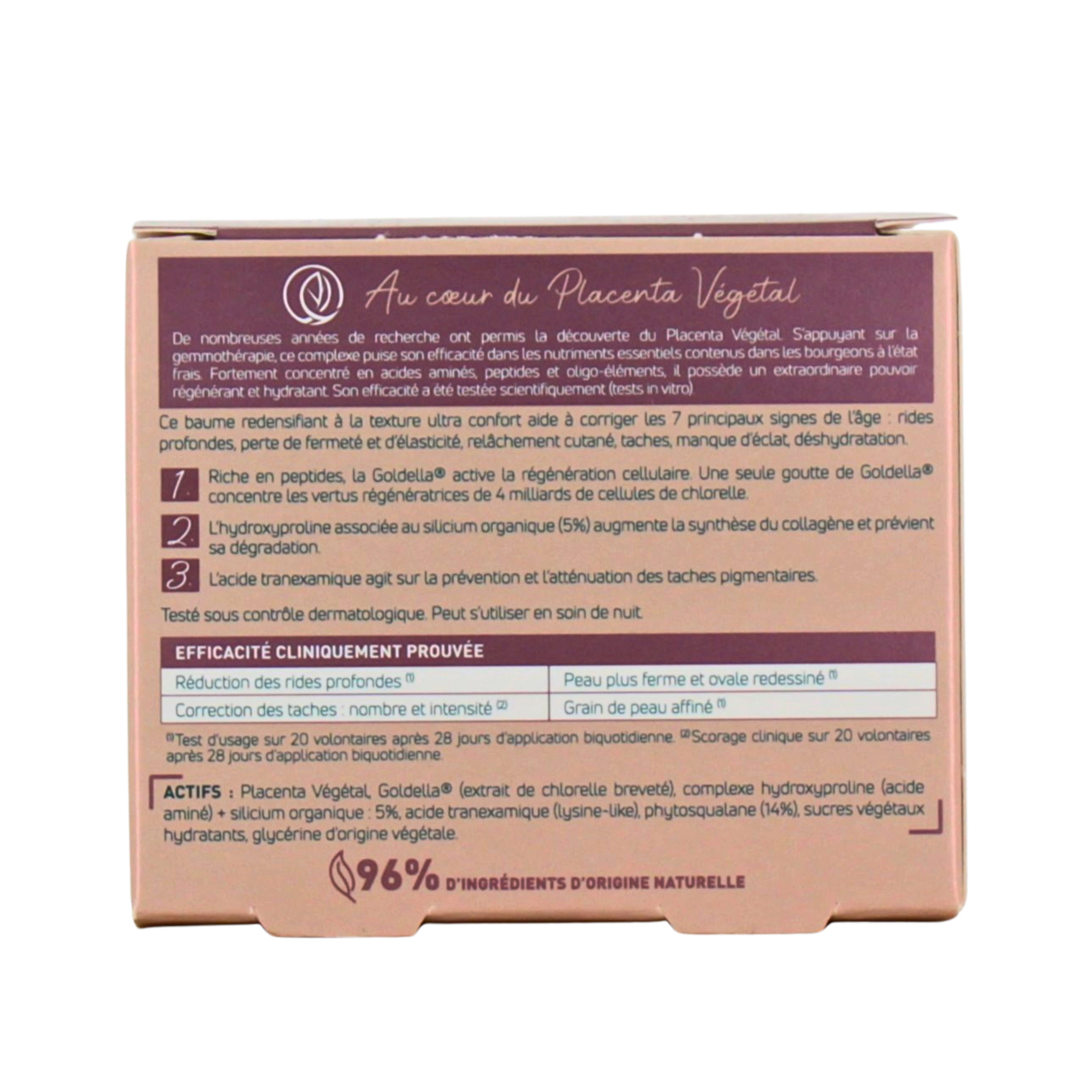 Pour une action structurelle en profondeur, la formule intègre aussi un puissant duo d’actifs : l'hydroxyproline combinée à 5 % de silicium organique. Ce complexe va augmenter la synthèse de collagène tout en prévenant sa dégradation naturelle. En parallèle, la Goldella est utilisée pour son rôle clé dans l'activation de la régénération cellulaire, ce qui contribue à améliorer la qualité globale de la peau. Le placenta végétal, dosé à 4 %, vient soutenir ce processus en régénérant et en réparant la peau. Enfin pour redonner confort et souplesse à votre peau, le baume redensifiant Anti-Taches Placentor Végétal est enrichi en ingrédients nutritifs et hydratants, tels que le phytosqualane (14 %), qui aide à restaurer la barrière lipidique, pour protéger la peau contre la déshydratation, ainsi que des sucres végétaux, pour optimiser la diffusion de l'hydratation au sein des couches cutanées.