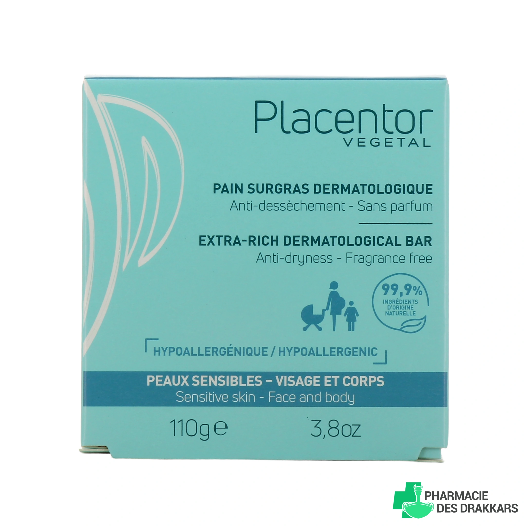 Vous pourrez retrouver le pain surgras dermatologique Placentor Végétal dans les présentations suivantes chez Pharmacie des Drakkars : savon en pain de 110 g.