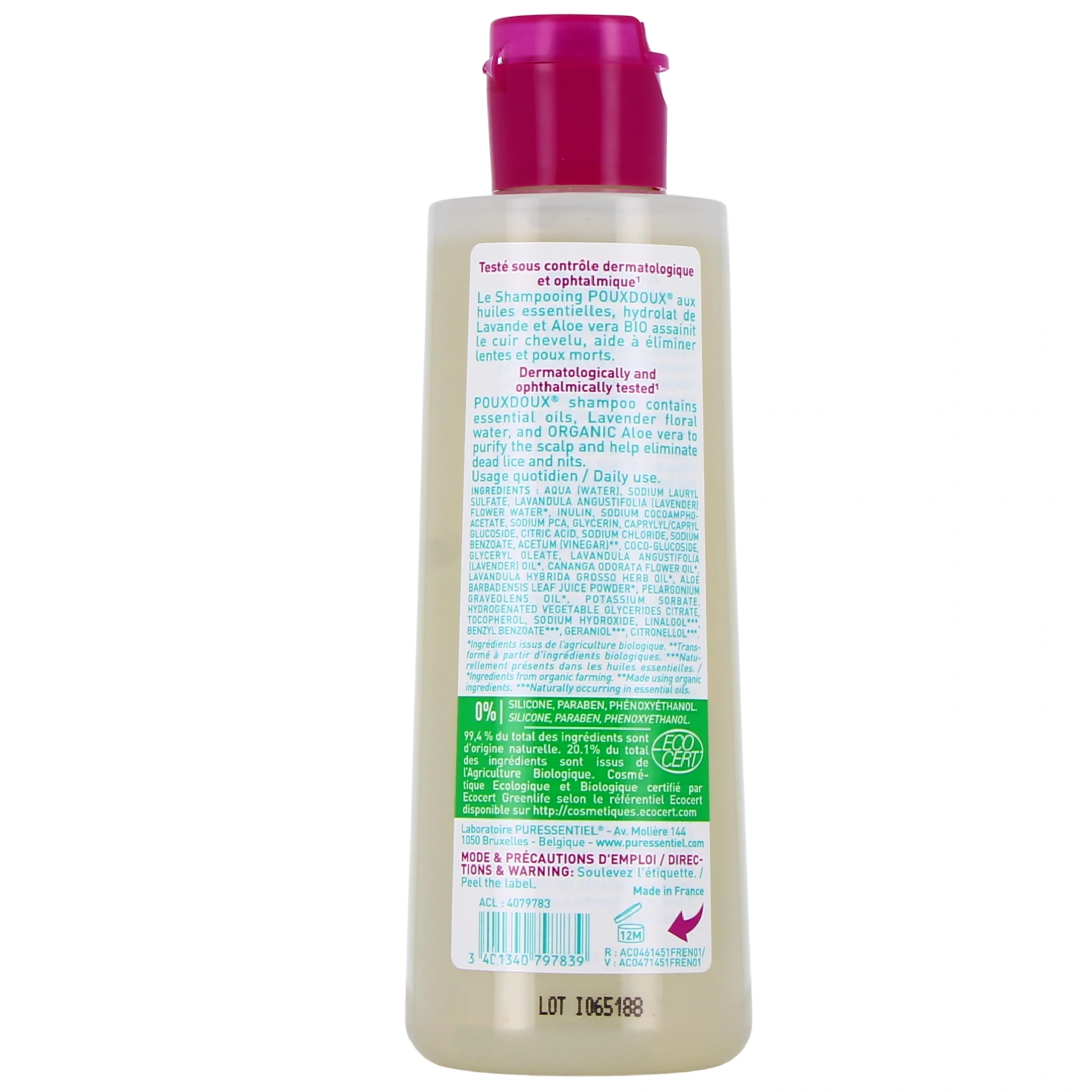 Formulé à 99,4% d'origine naturelle, le shampooing Pouxdoux est un produit naturel dont la formule associe de l'aloe vera et des huiles essentielles. Il s'utilise en complément de la lotion traitante pour décoller les lentes et éliminer les poux morts. Sa formule Bio et très douce permet de l'utiliser au quotidien pour éviter les récidives.
