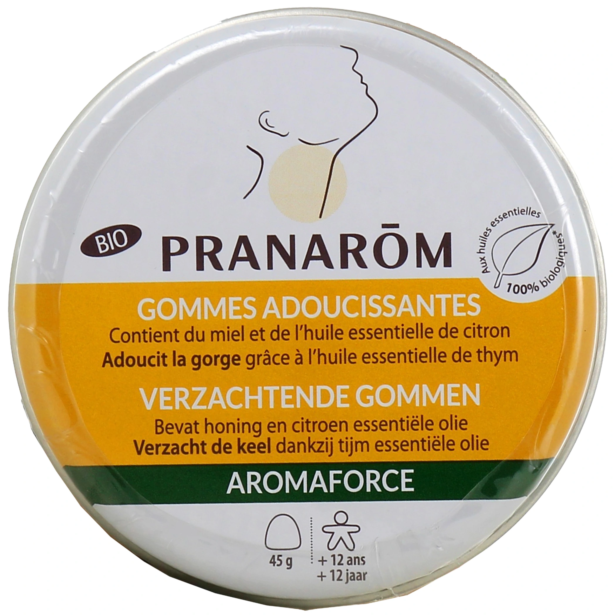 Présentation proposée par votre pharmacie en ligne : boîte de 45 grammes de gommes adoucissantes.