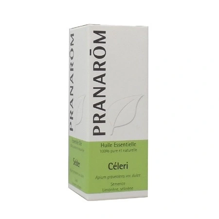 L' huile essentielle de céleri est obtenue par distillation de le semence de Apium graveolens var. dulce, les molécules aromatiques obtenues sont: Limonène, sélinène. C'est un produit d'aromathérapie des la boratoires Pranarom.