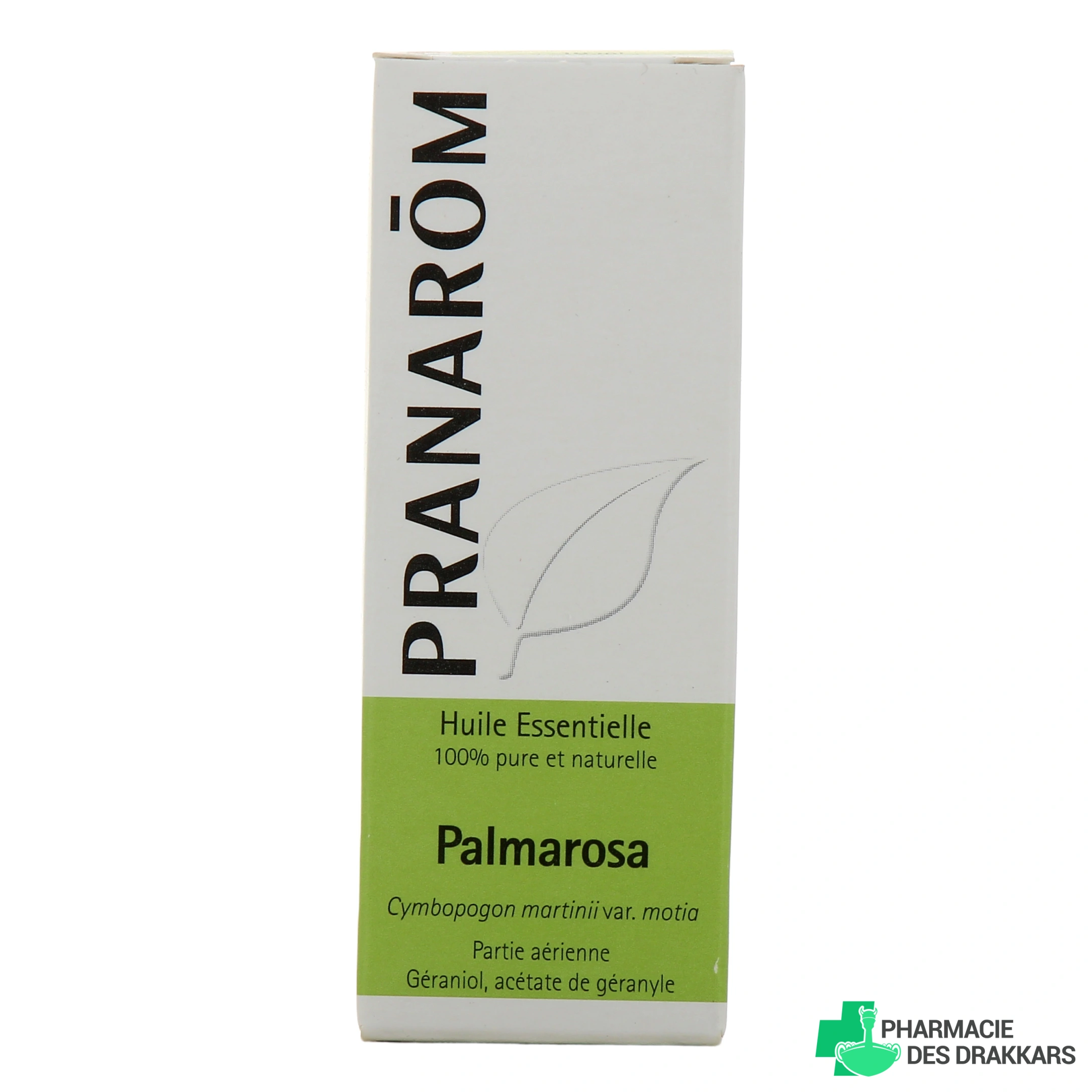 L'huile essentielle Palmarosa des laboratoires Pranarom est obtenue par distilation de la partie aérienne de Cymbopogon martini var.motia, les molécules aromatiques ainsi extraites sont le géraniol et acétate de géranyl.