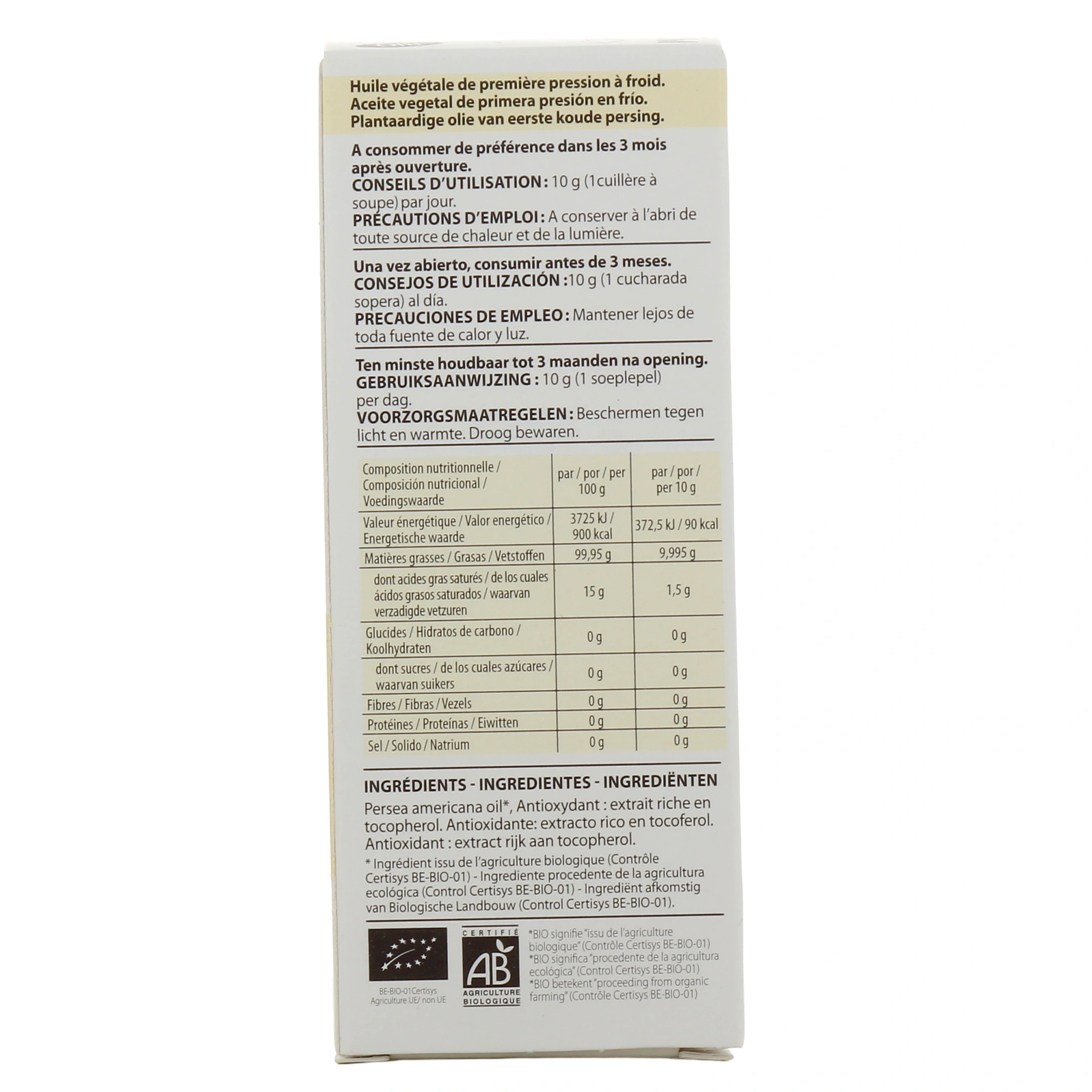 L'huile d'avocat Bio est composée à environ deux tiers d'acides gras mono-insaturés (Oméga 9 et acide palmitoléique), de quelques acides gras polyinsaturés (Oméga 6) et acides gras saturés, mais aussi de nombreuses vitamines (bêta-carotène, vitamine E, etc.).