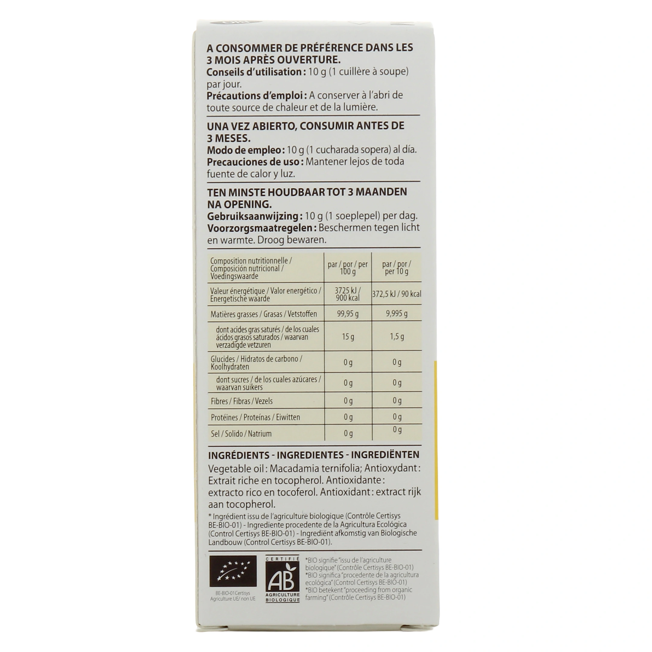 L'huile végétale de macadamia bio proposée par la marque Pranarom est destinée à une utilisation par voie orale. Il s'agit d'une huile végétale 100 % pure et naturelle, vierge de première pression à froid des noix de macadamia.