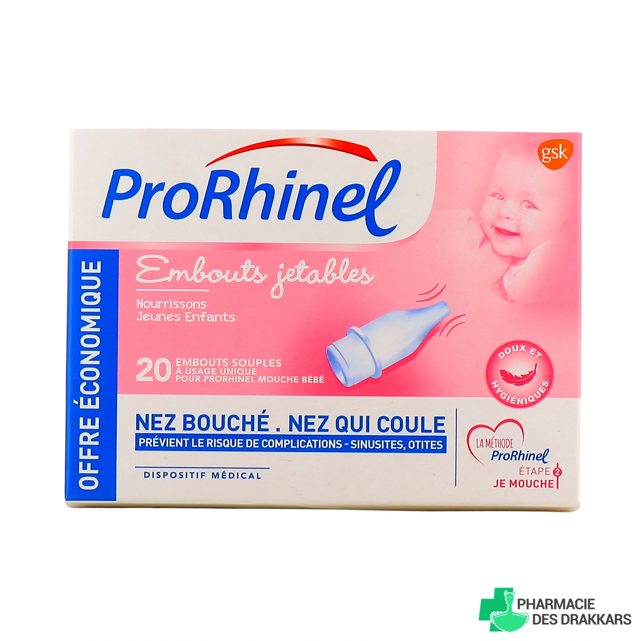 Précautions d'emploi : Chaque embout Prorhinel est conçu pour une seule utilisation, un seul mouchage, bien jeter l'embout nasal après utilisation. Ne pas laisser à la portée de votre bébé.