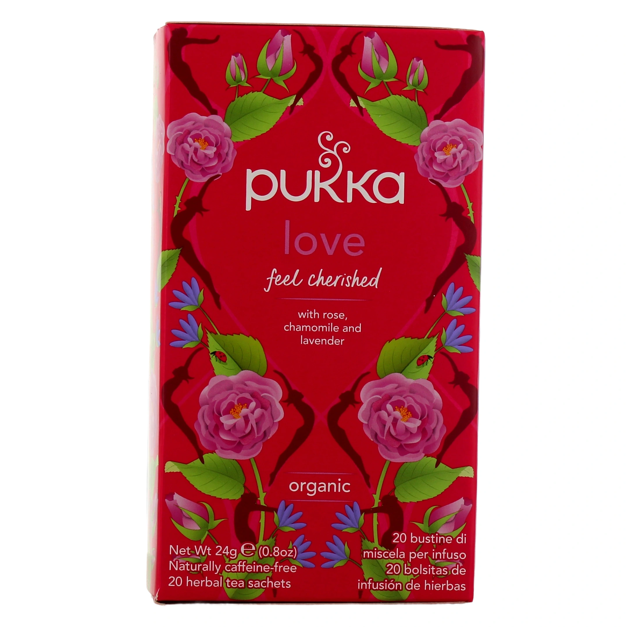 Avec l'infusion bio Amour proposée par la marque Pukka, laissez-vous aller dans une douce étreinte de rose, camomille et lavande. Cette infusion est composée à 100 % d'ingrédients biologiques et cultivés de façon équitable.
