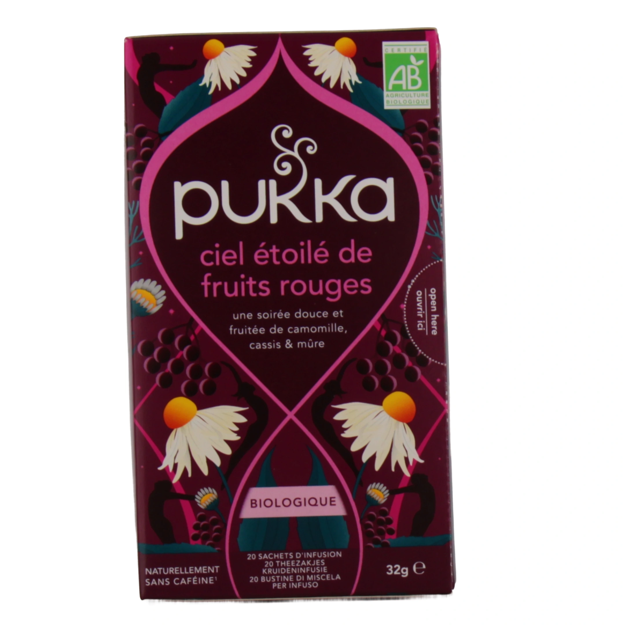 Vous pourrez retrouver l'infusion Ciel étoilé de Fruits Rouges de Pukka dans les présentations suivantes sur notre pharmacie en ligne : boîte de 20 sachets d'infusion (32 g).