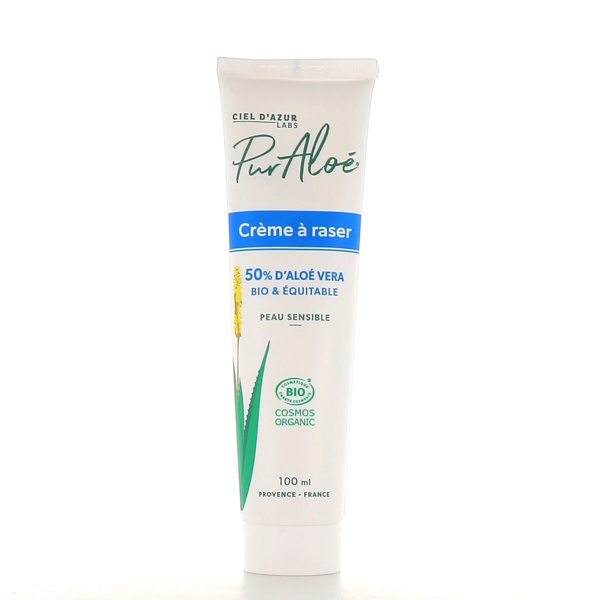 Présentation disponible sur notre pharmacie en ligne pour la crème à raser bio Pur Aloé : Tube de 100 ml