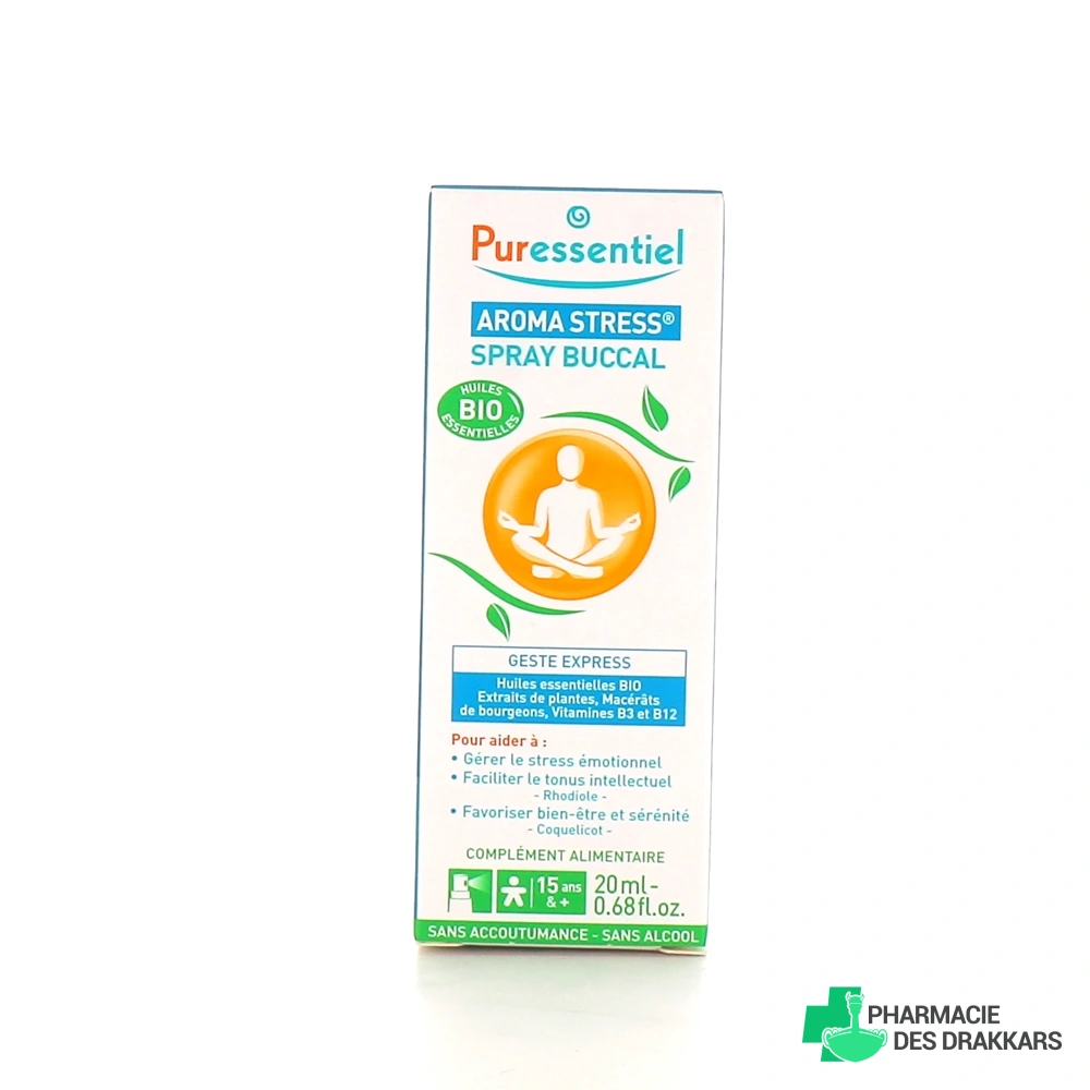 Le spray buccal Aroma Stress de Puressentiel est un complément alimentaire. Il contient des huiles essentielles bio, des extraits de plantes, des macérâts de bourgeons et des vitamines pour aider à gérer le stress émotionnel.