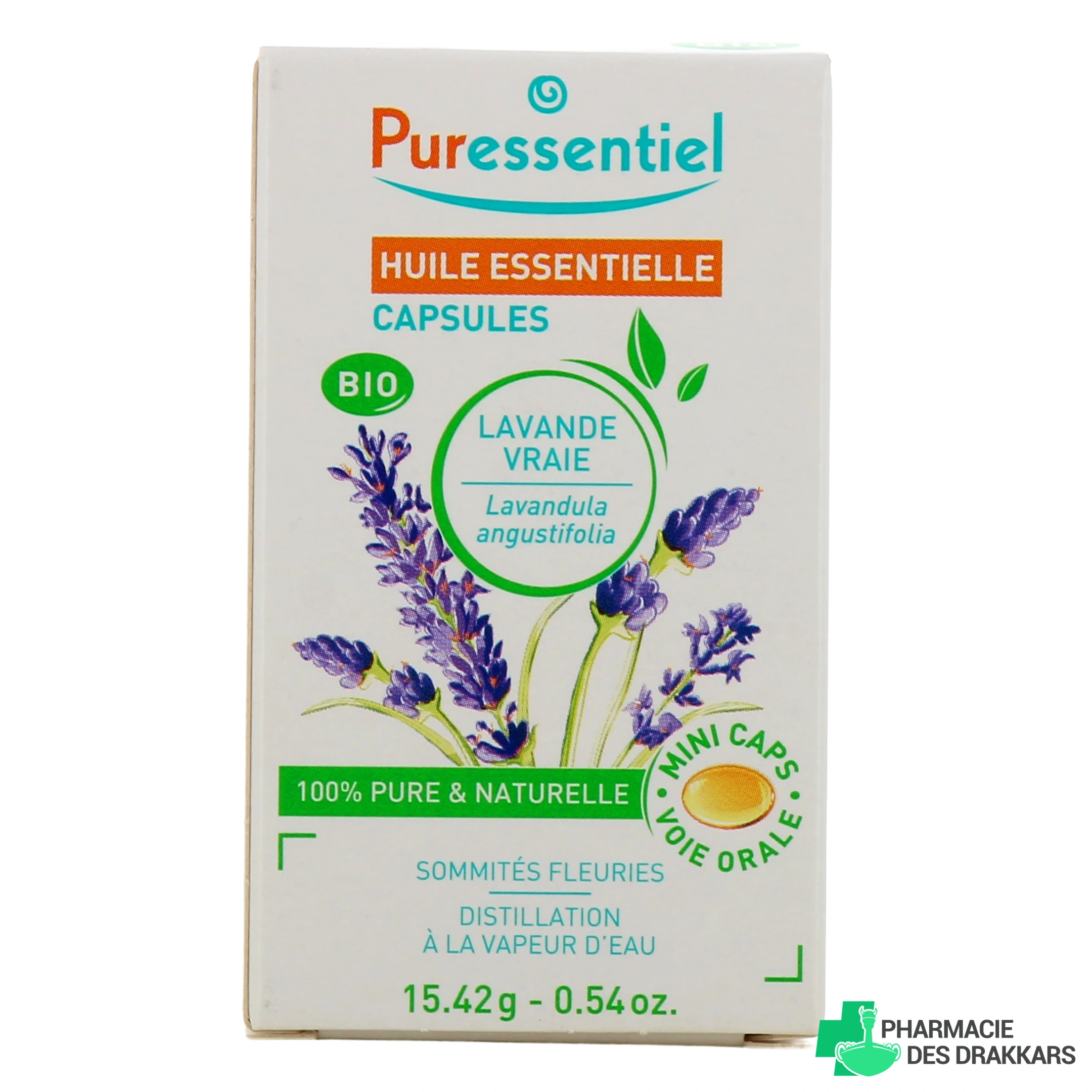 Présentation proposée pour les capsules Lavande Vraie Puressentiel sur notre pharmacie en ligne : Flacon de 60 capsules
