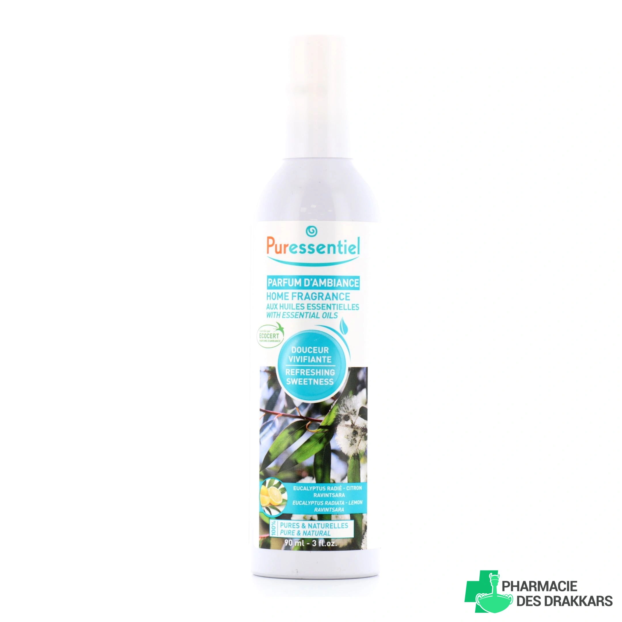 Présentation proposée par votre pharmacie en ligne pour les parfums d'ambiance aux huiles essentielles Puressentiel : Flacon-spray de 90ml - 3 parfums au choix : Douceur de Provence, Douceur d'Agrumes ou Douceur Vivifiante.