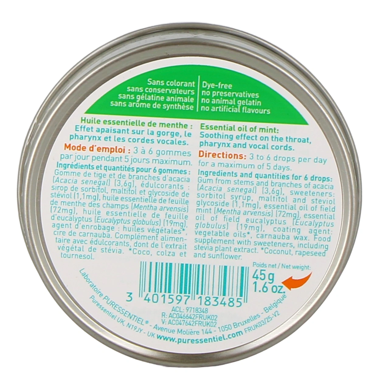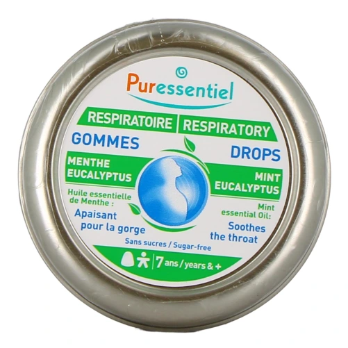 Présentation proposée par votre pharmacie en ligne pour les gommes adoucissantes Menthe Eucalyptus Puressentiel Respiratoire : Boîte de 45 grammes.