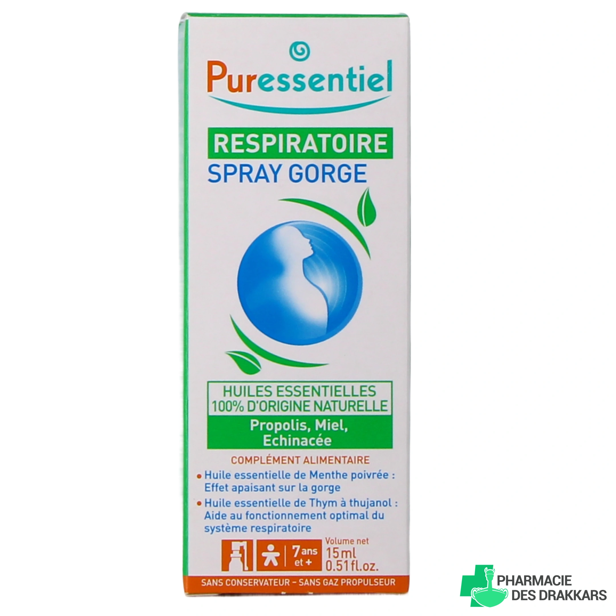 Conditionnements proposés par la Pharmacie des Drakkars pour le spray gorge Puressentiel Respiratoire : Spray de 15ml - Offre duo.
