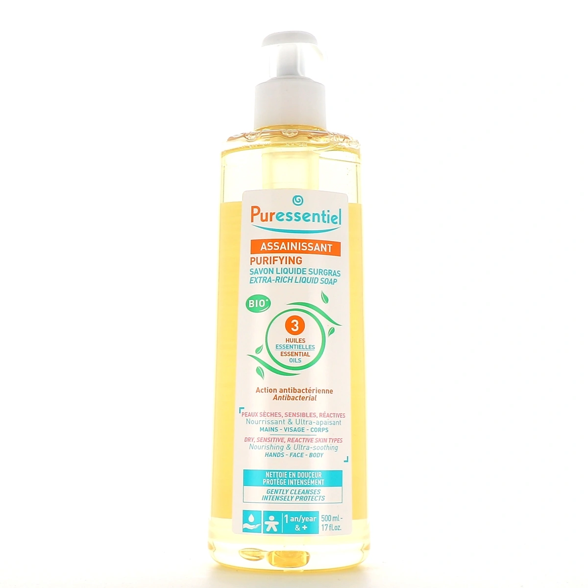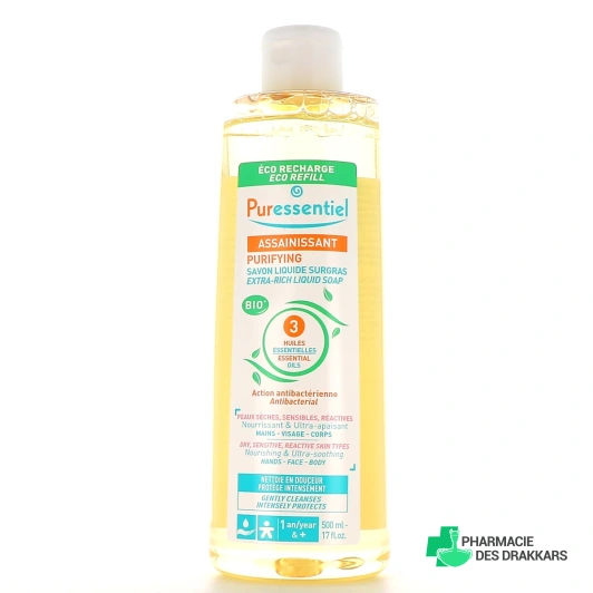 Le savon liquide surgras assainissant Puressentiel s'utilise au quotidien pour nettoyer en douceur et protéger les peaux de toute la famille.