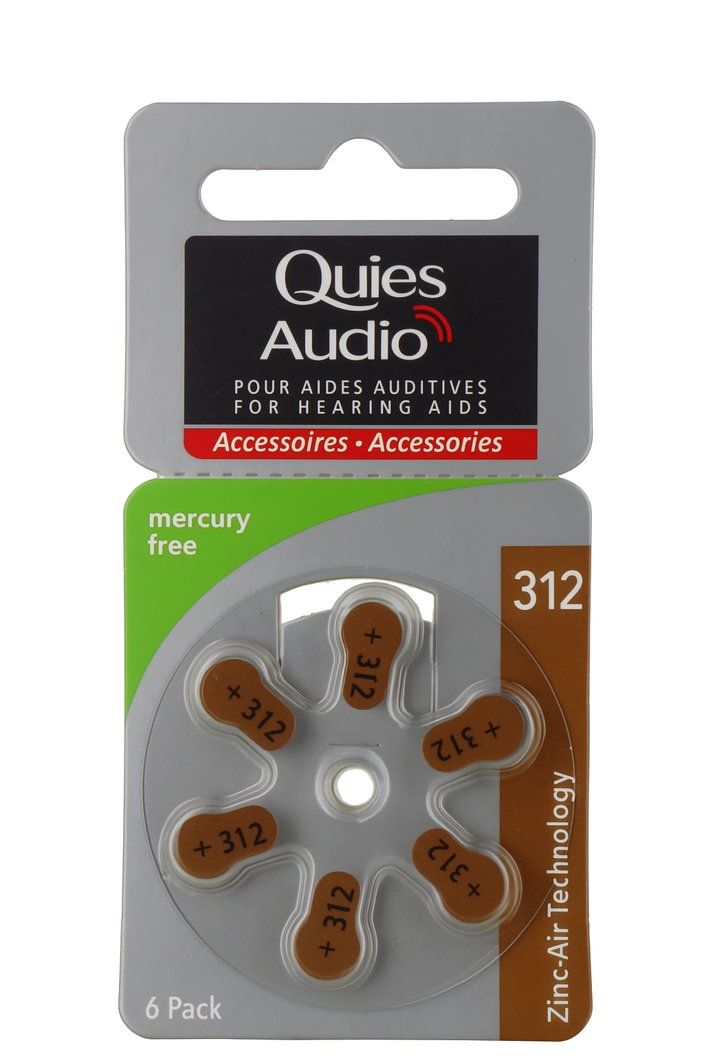 Equipées de la Technologie Zinc Air et fabriquées sans mercure, les piles auditives modèle 312 Quies Audio utilisent l'air à l'extérieur de la pile comme source d'énergie.