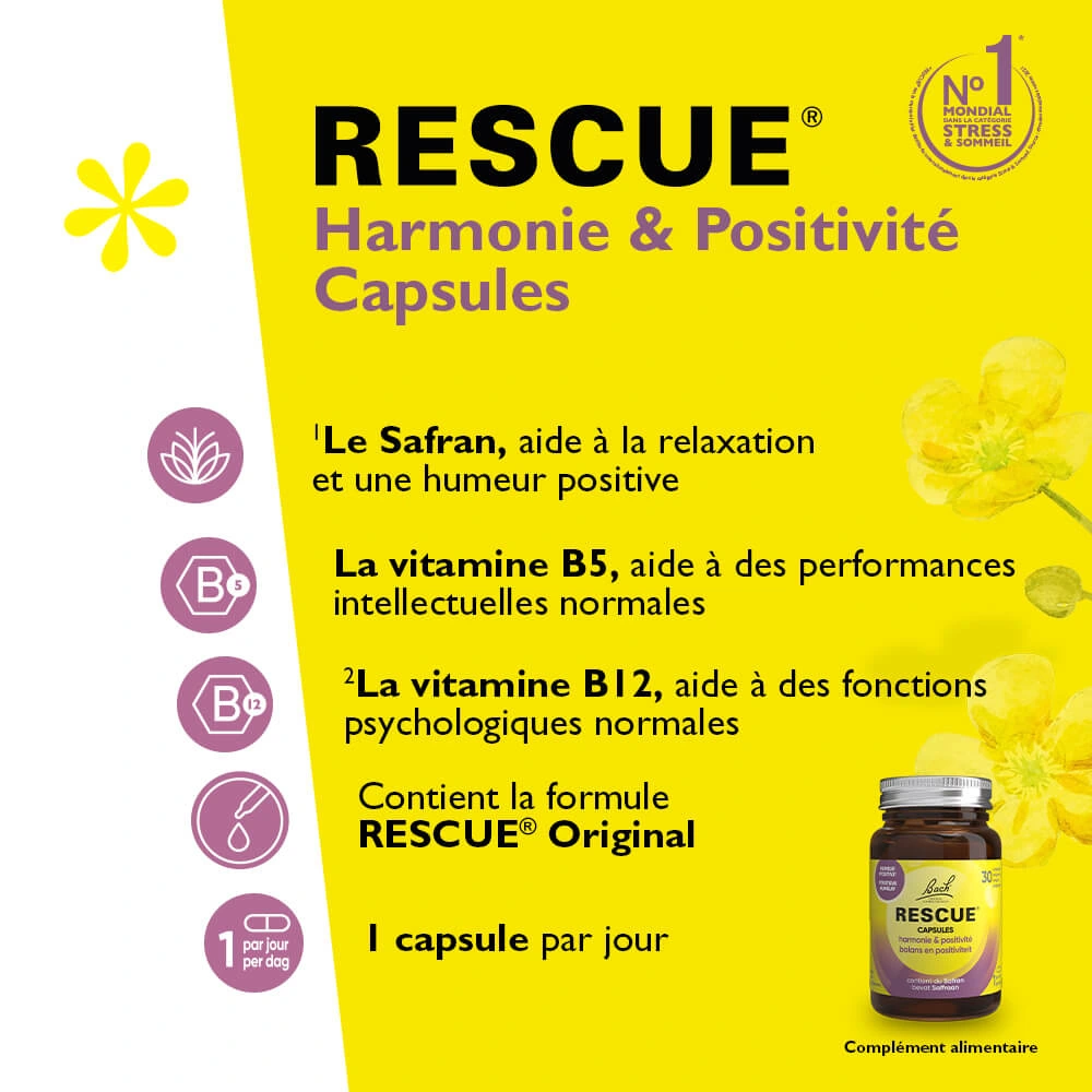 Les capsules Harmonie & Positivité RESCUE® renferment une association unique d'ingrédients. L'objectif de ces capsules RESCUE® est de préserver l'équilibre émotionnel et mental lors de périodes intenses grâce à :