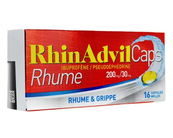 RhinAdvil Caps Rhume & Grippe est un médicament qui contient de l'ibuprofène, un anti-inflammatoire non stéroïdien. Ce médicament est indiqué chez l'adulte et l'adolescent de plus de 15 ans en cas de symptômes de rhume et de grippe.