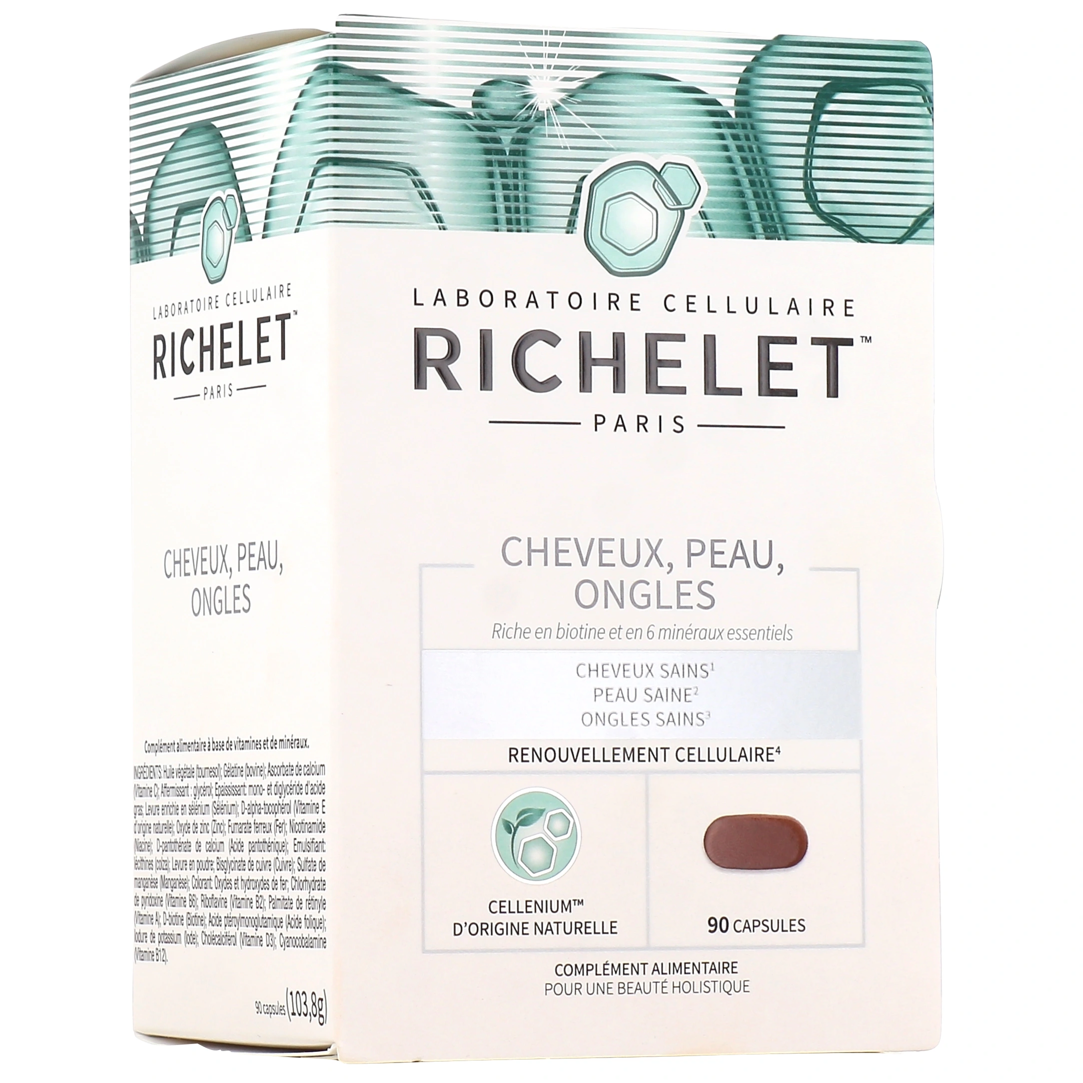Richelet Cheveux Peau Ongles est un complément alimentaire riche en biotine et en 6 minéraux essentiels. Il participe au renouvellement cellulaire et au maintien de cheveux sains, d'une peau saine et d'ongles sains.