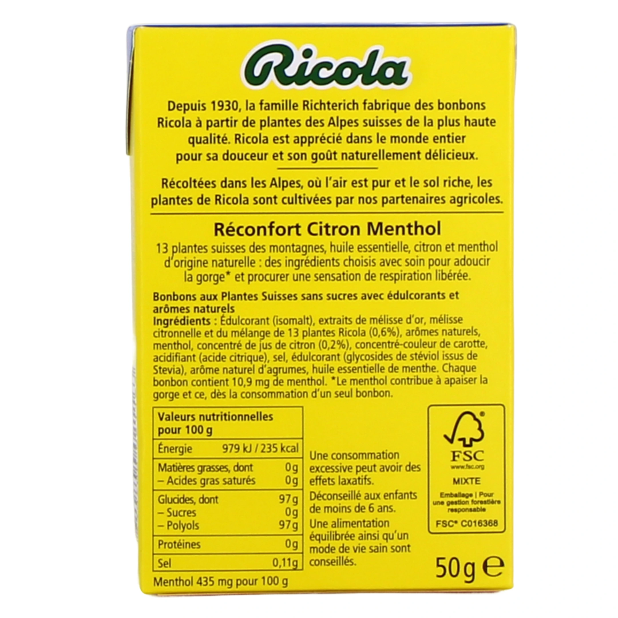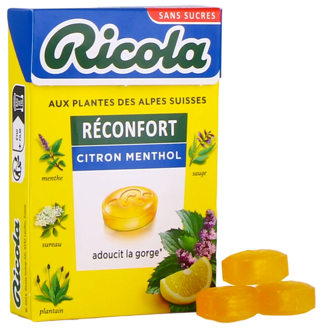 Bonbons Ricola Réconfort - Citron Menthol : plantes des Alpes suisses, fraîcheur et piquant du citron