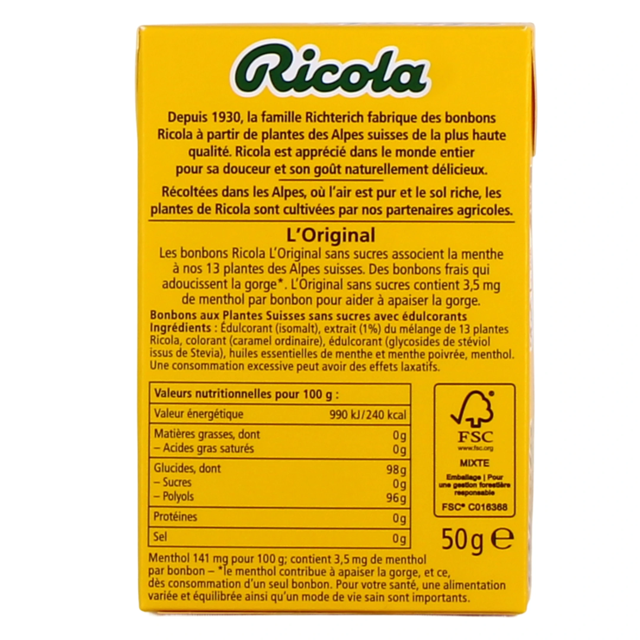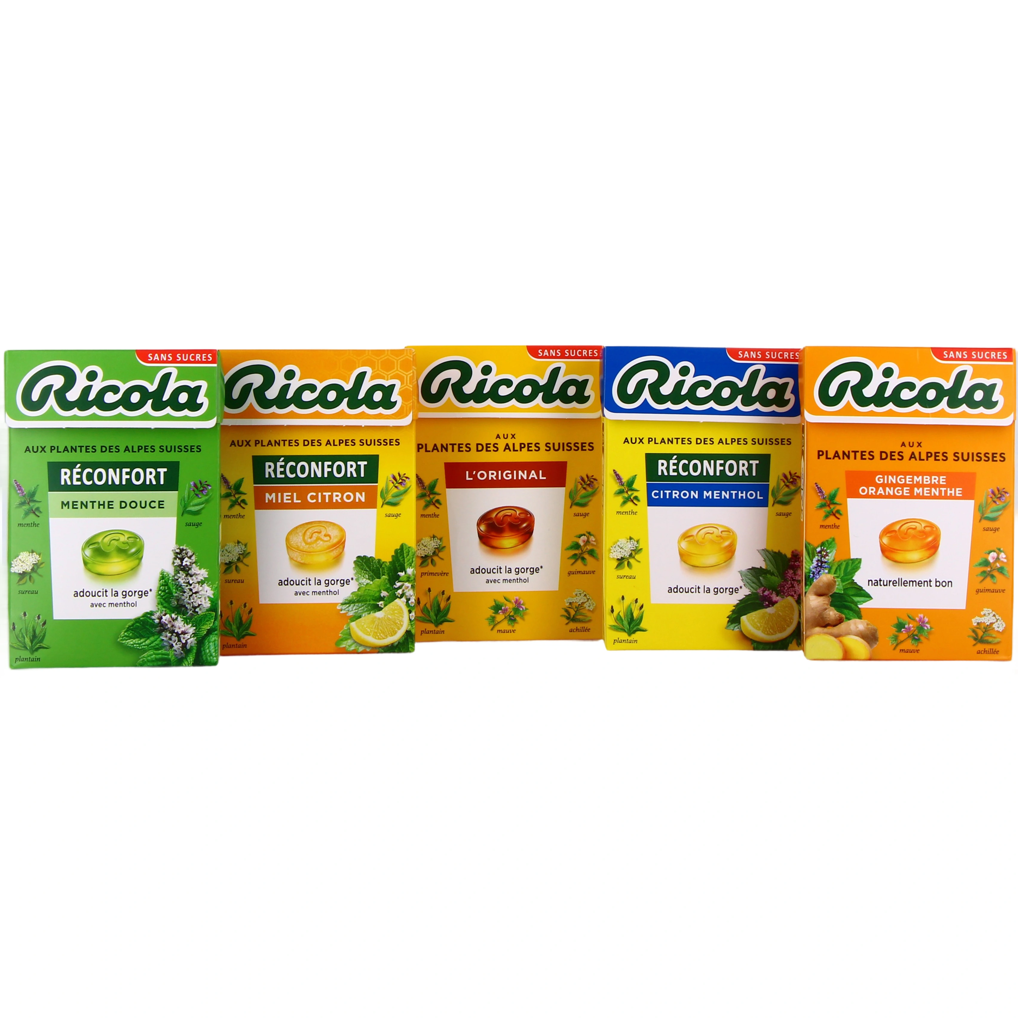 Disponibles en versions Classique ou Réconfort (qui adoucit la gorge), les bonbons Ricola sont des pastilles à sucer sans sucres qui sont aujourd'hui encore fabriquées en Suisse. Édulcorés à la stévia, et contenant uniquement des arômes d'origine naturelle, ces bonbons sont proposés dans de nombreux parfums, pour plaire au plus grand nombre et s'adapter aux différentes périodes de l'année.
