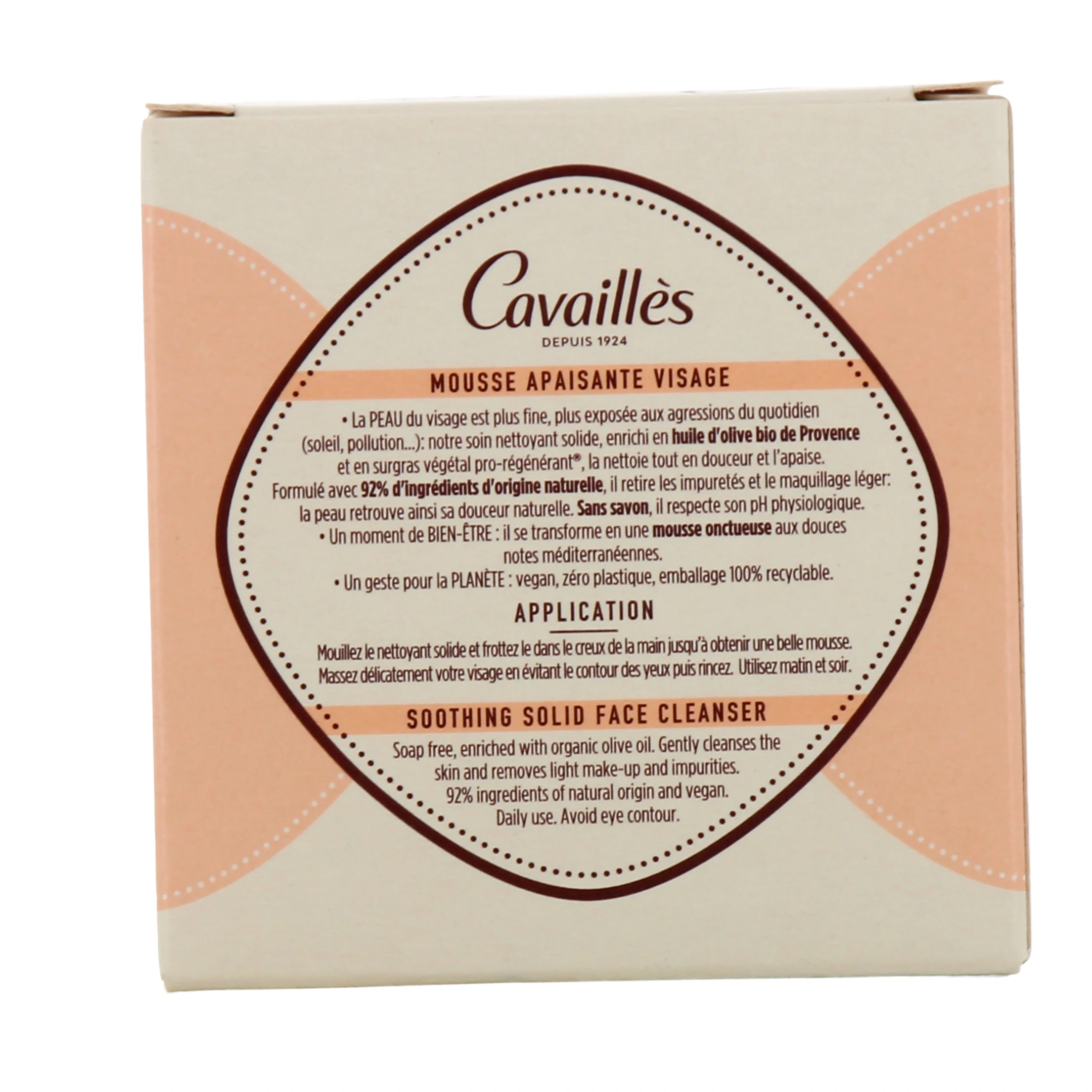- Le nettoyant visage solide Mousse Apaisante, à base d'huile d'olive bio de Provence, qui nettoie en douceur, apaise les sensations d'inconfort et délivre une mousse onctueuse aux douces notes méditerranéennes.