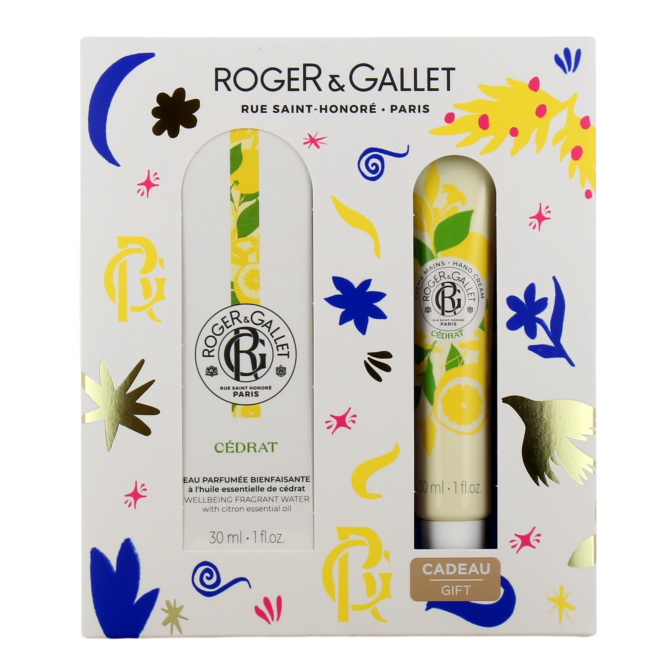 Présentations disponibles pour le coffret Roger et Gallet eau parfumée et crème mains 2025 : Eau parfumée bienfaisante 30 ml et crème mains 30 ml offerte, senteur au choix.