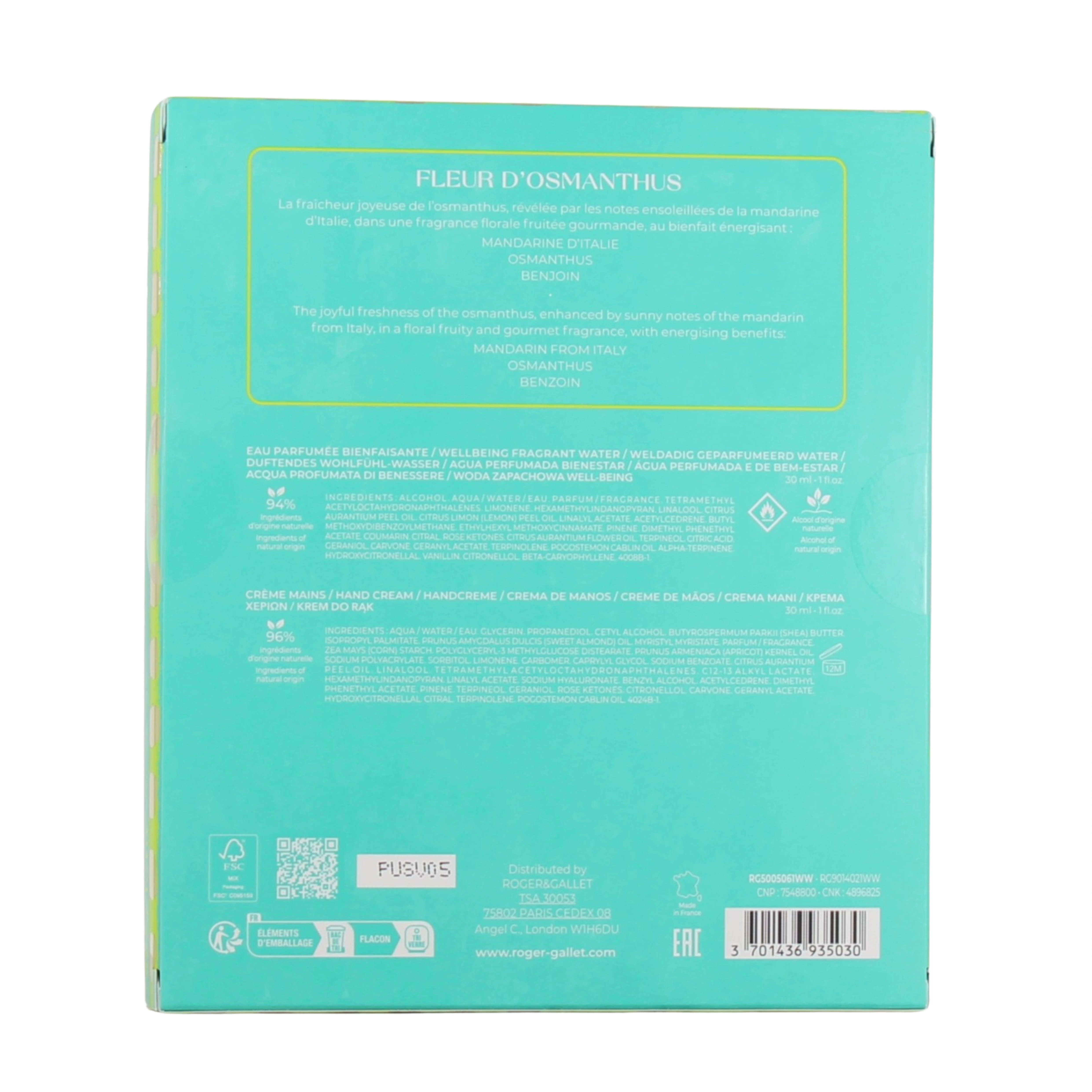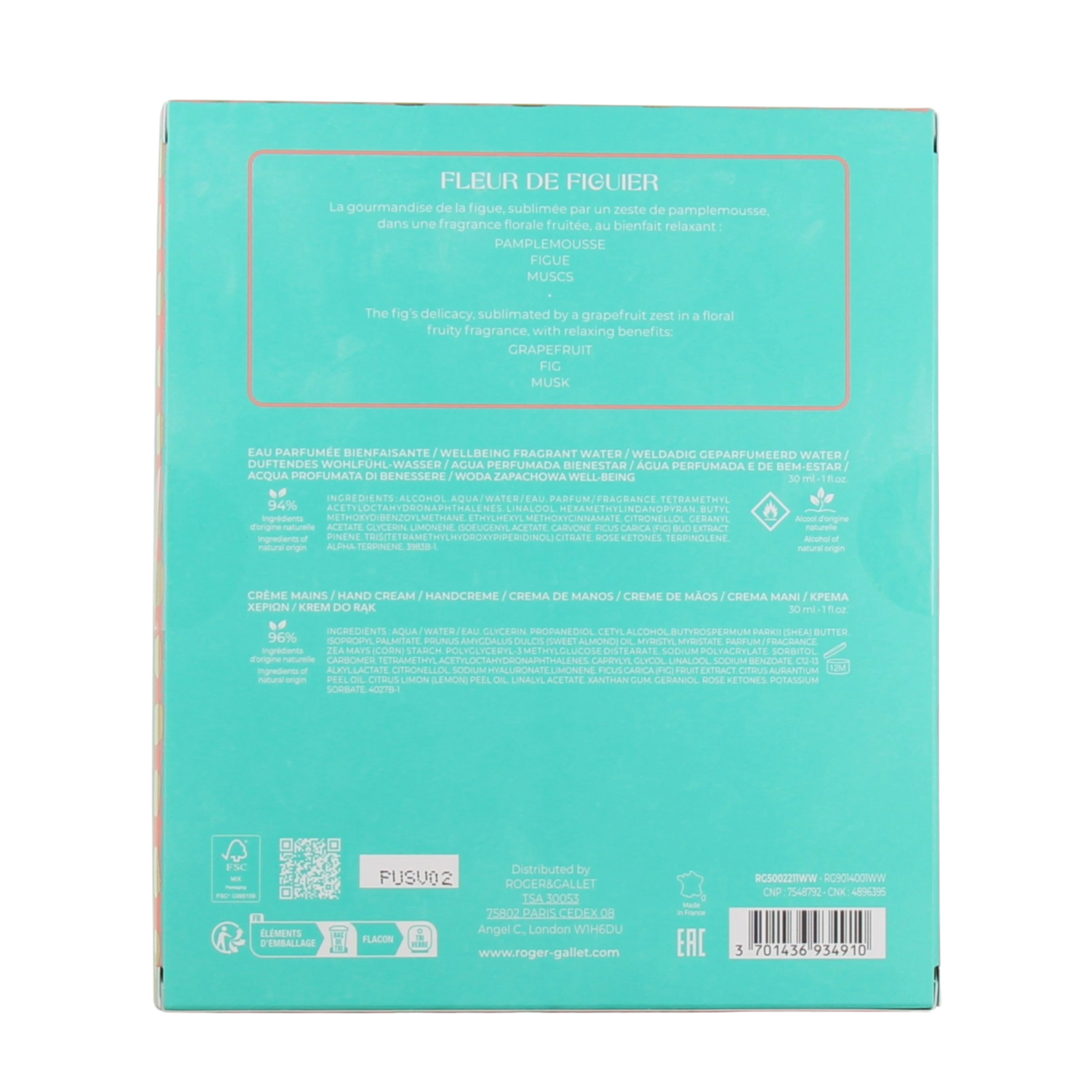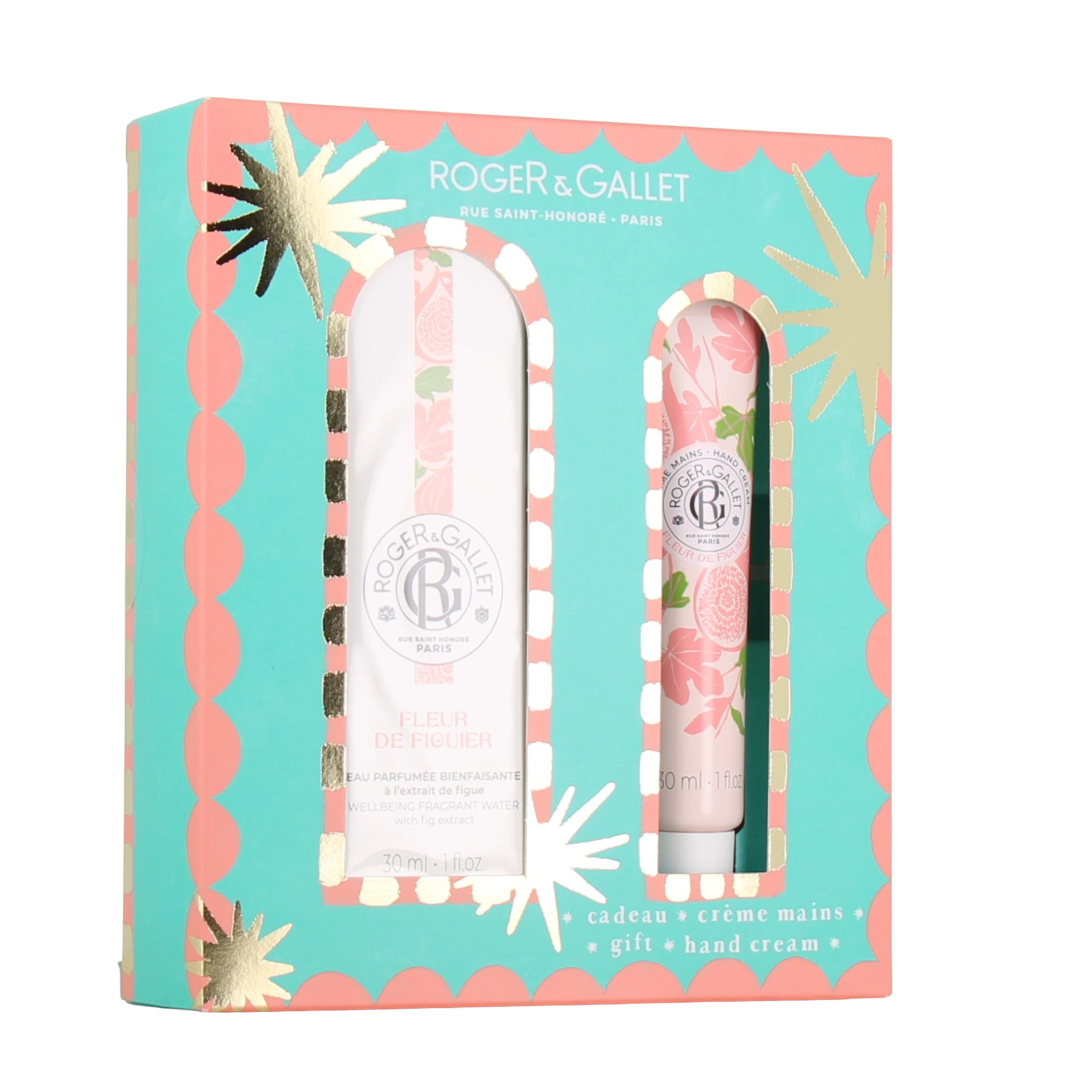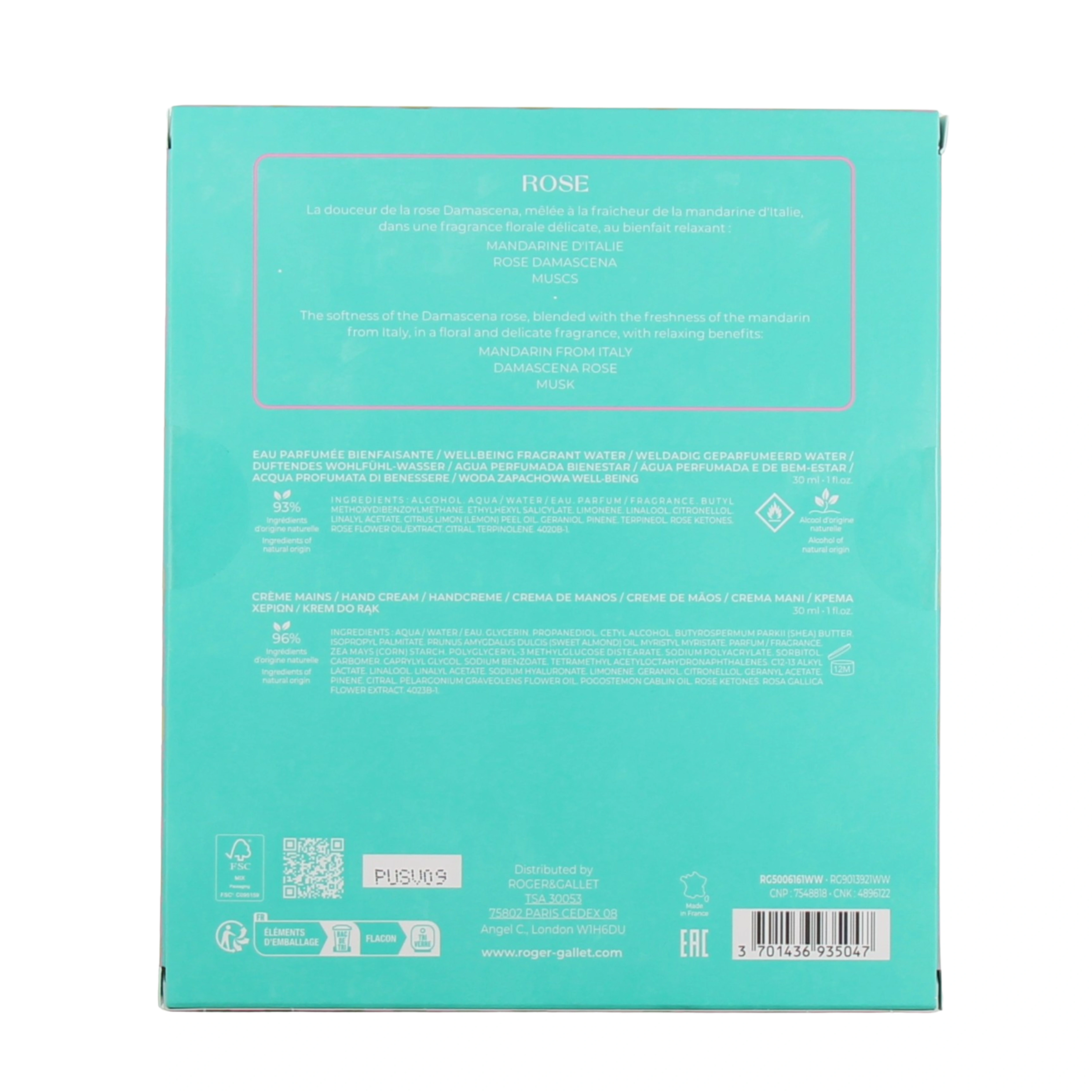 Présentations disponibles pour le coffret Roger et Gallet eau parfumée et crème mains : Eau parfumée bienfaisante 30 ml et crème mains 30 ml offerte, senteur au choix.