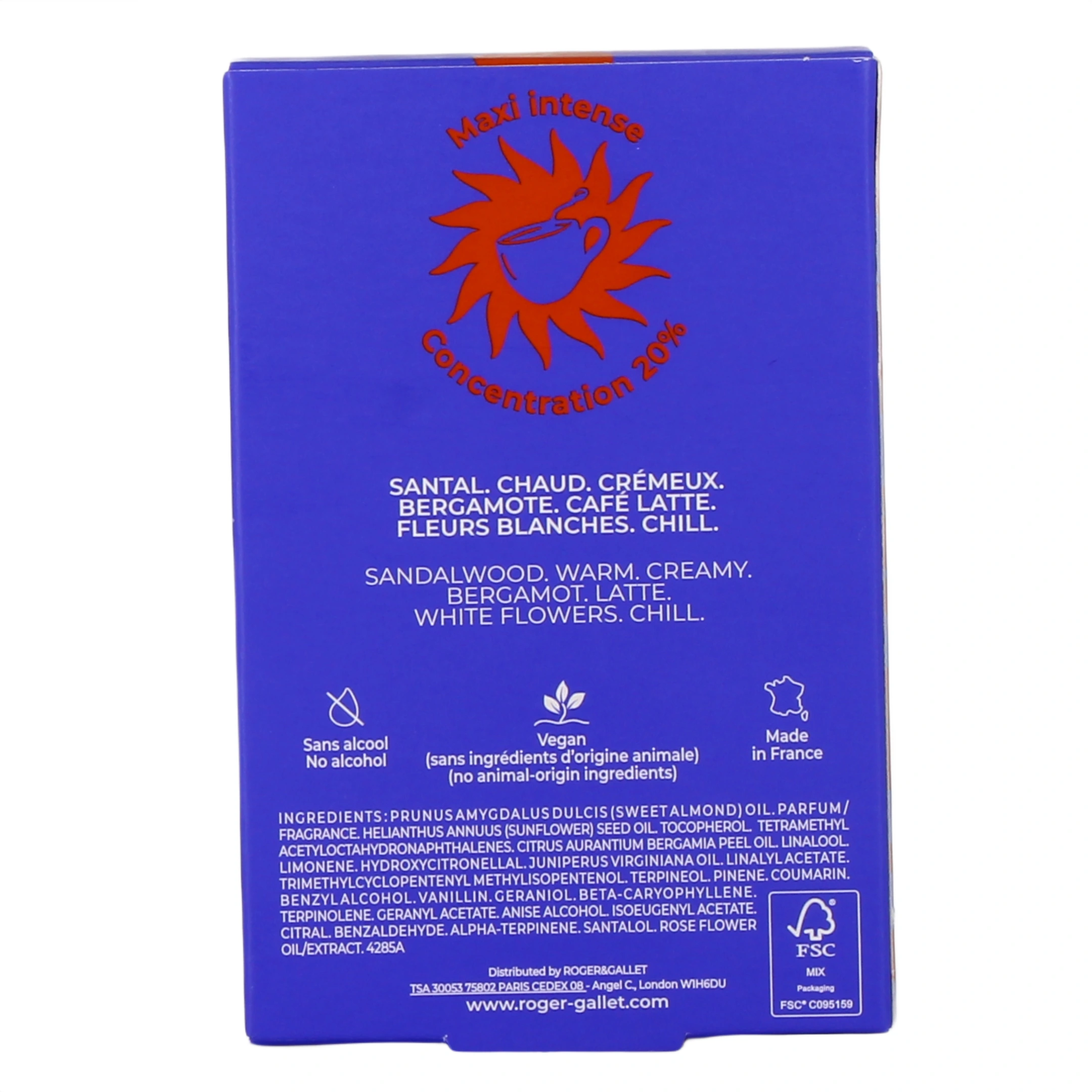 - Roger et Gallet Café Roger : une senteur chaude et crémeuse aux notes de café latte, de fleurs blanches lactées et de bois de santal ;