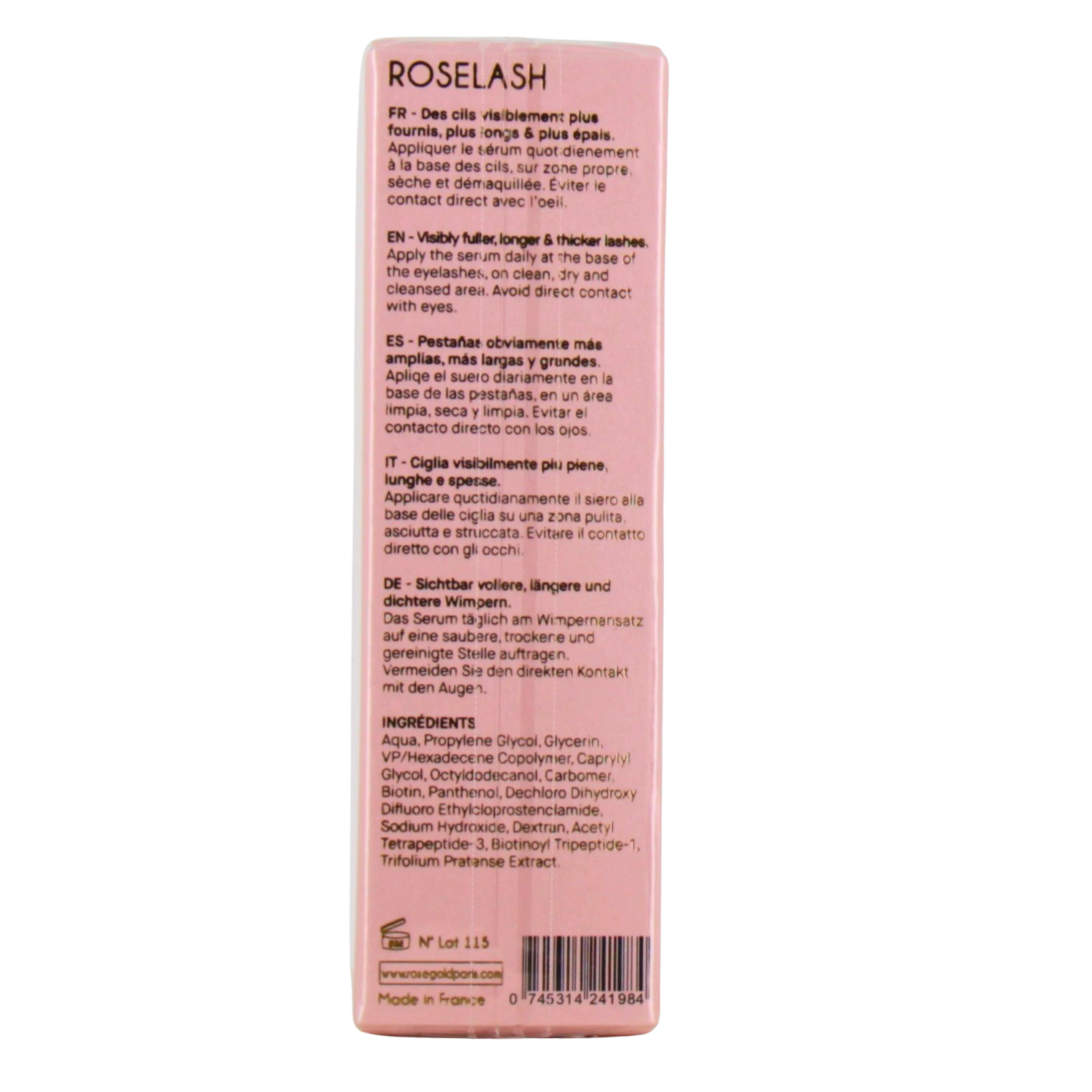 Le sérum de croissance pour cils Roselash Rosegold s'utilise très bien avec le sérum Roselift (pour le contour des yeux) ou Rosebrow (pour les sourcils) de la même gamme. Sa formule contient plus de 98% d'ingrédients issus de la nature sans que son efficacité n'en pâtisse. Vous obtiendrez de meilleurs résultats en utilisant le sérum pour cils Roselash en cure de 3 à 6 mois selon vos besoins.