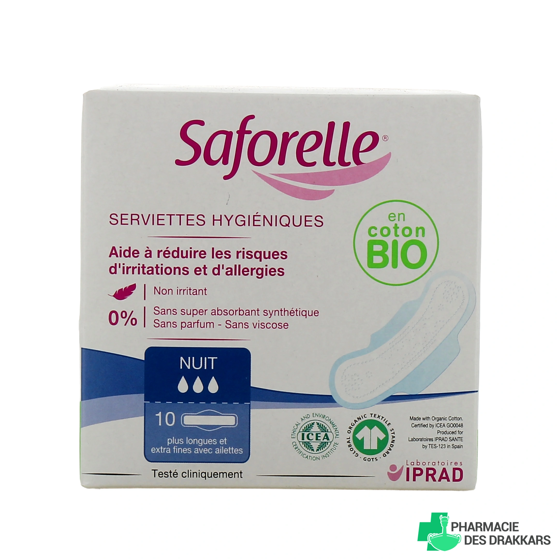 Pour une protection optimale et renforcée tout au long de la nuit, les serviettes hygiéniques de nuit Saforelle sont plus longues afin d'absorber tous les flux. Par ailleurs, elles sont équipées d'ailettes pour qu'elles restent bien en place malgré les mouvements. Non irritantes, sans viscose et sans parfum, ces serviettes hygiéniques de nuit respectent parfaitement la zone intime. Naturellement micro-aéré, le coton bio utilisé pour la conception de ces serviettes intimes laisse bien respirer la peau et permet de réguler le taux d'humidité pour que vous restiez bien au sec.