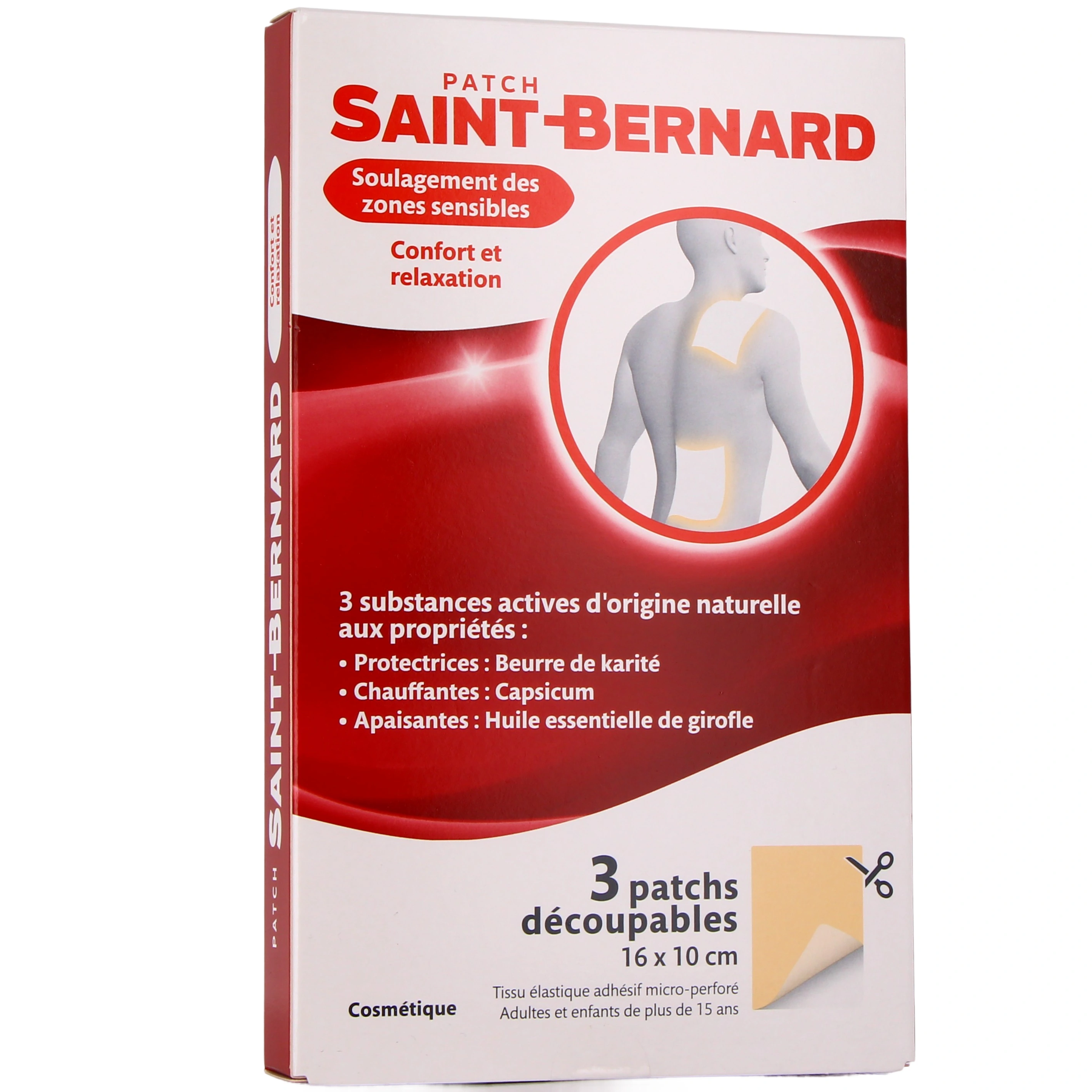 Vous pourrez retrouver les patchs Saint Bernard dans les présentations suivantes sur notre pharmacie en ligne : boîte de 3 patchs découpables (dimensions : 16 x 10 cm).