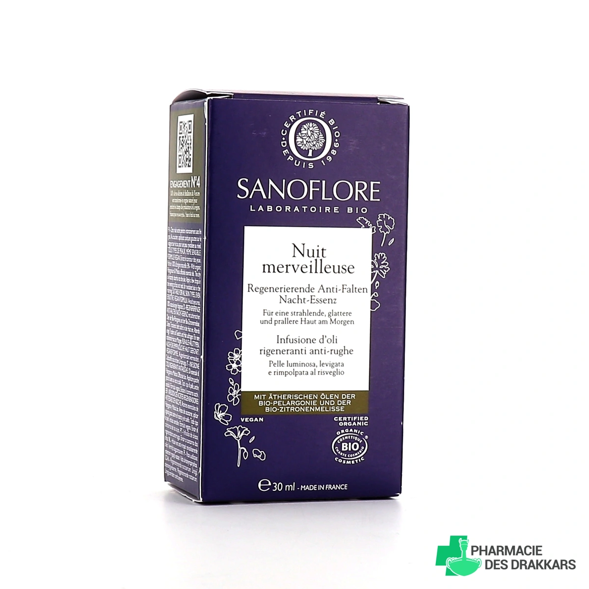 L'essence Nuit Merveilleuse a été développée par Sanoflore pour lisser, régénérer et repulper visiblement la peau au cours de la nuit, période propice à la pénétration des actifs. En effet, c'est au cours de la nuit que les actifs pénètrent le mieux, moment durant laquelle la peau de notre visage se repose et n'a pas besoin de lutter contre les agressions extérieures quotidiennes. Les huiles essentielles qui composent cette essence sont l'huile de Pelargonium Bio et l'huile de Melissa officinalis Bio. Ces huiles sont associées à des huiles végétales sélectionnées pour pénétrer dans la peau instantanément pour offrir une action anti-âge immédiate.