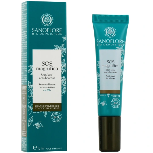 SOS Magnifica Sanoflore est un soin anti-imperfections à appliquer localement. Il repose sur le brevet Magnifica, constitué d'une synergie de 9 huiles essentielles sélectionnées pour leurs propriétés purifiantes, antibactériennes et anti-inflammatoires. On retrouve également de la menthe poivrée, purifiante, et de l'huile essentielle d'origan à l'action anti-rougeurs. Enfin, l'acide salicylique est un actif de référence pour lutter contre les imperfections en raison de ses vertus exfoliantes, séborégulatrices et antibactériennes.