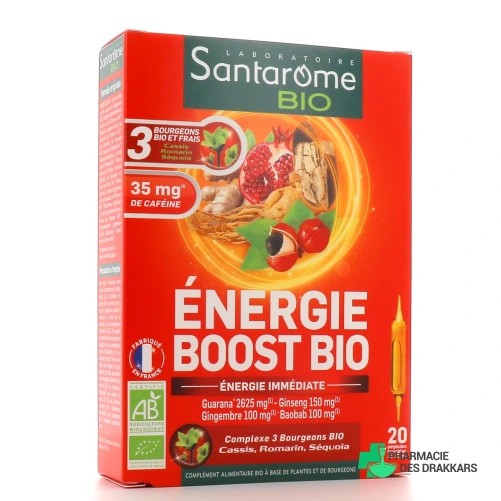 Conditionnement proposé par votre pharmacie en ligne pour Santarome Energie Boost Bio : boîte de 20 ampoules de 10 ml.