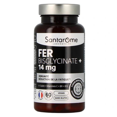 Santarome Fer Bisglycinate est un complément alimentaire à base de fer bisglycinate pour l'immunité et la réduction de la fatigue. Sa formule est complétée par du cuivre, des vitamines du groupe C ainsi que des vitamines B9 et B12.