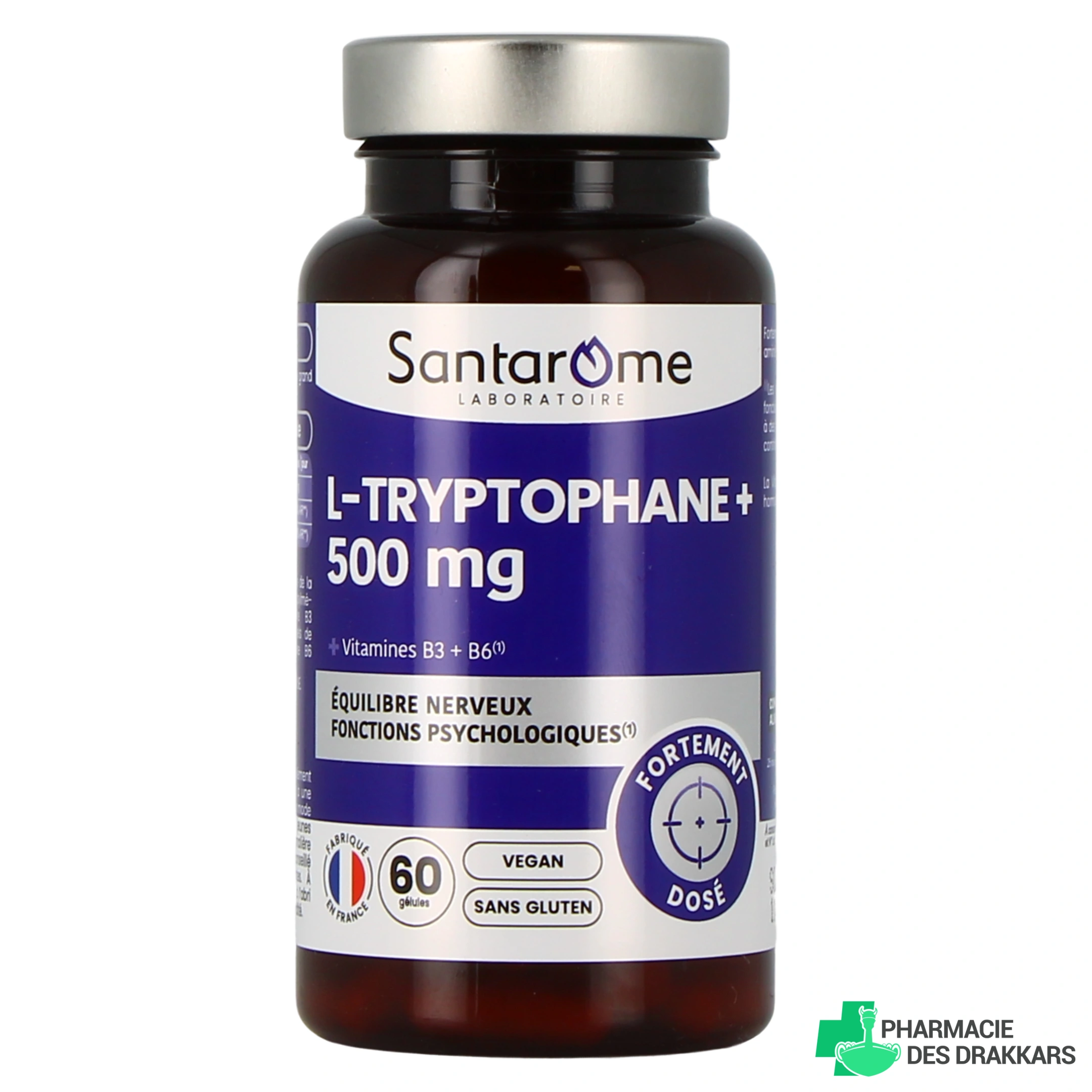 Le L-Tryptophane, sélectionné par Santarome, est dosé à 500 mg avec une formule complétée par des vitamines B3 et B6 :
